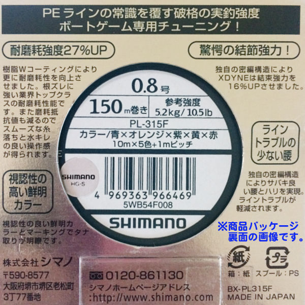 ★メーカー= シマノ ★品名= XDYNE 炎月 ★品番= PL-315F ★号数= 0.8号 ★長さ= 150m ★カラー= 10m×5色(青・橙・紫・黄・赤)+1mマーキング(画像をご覧下さい。) |