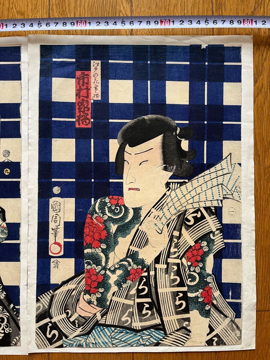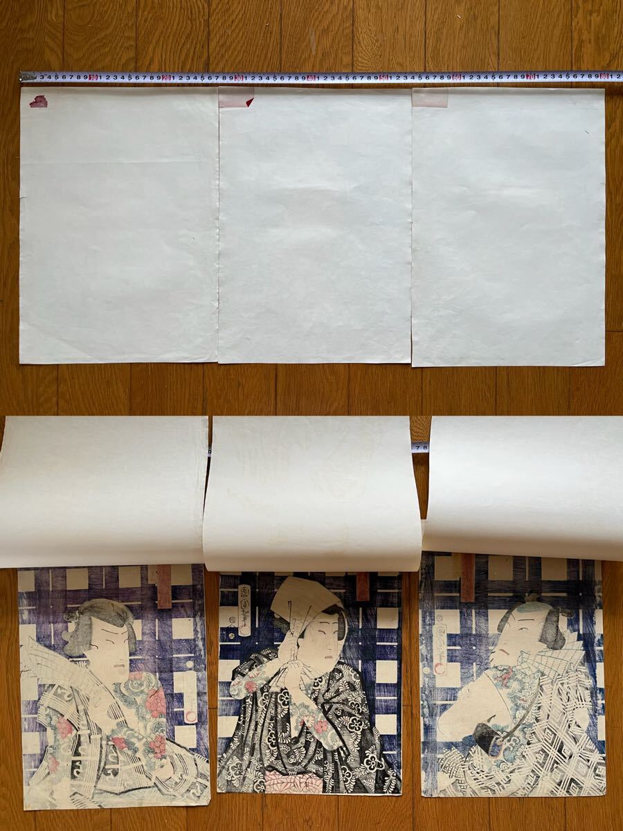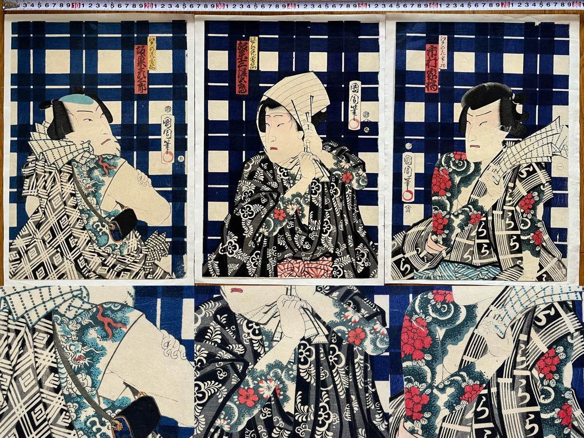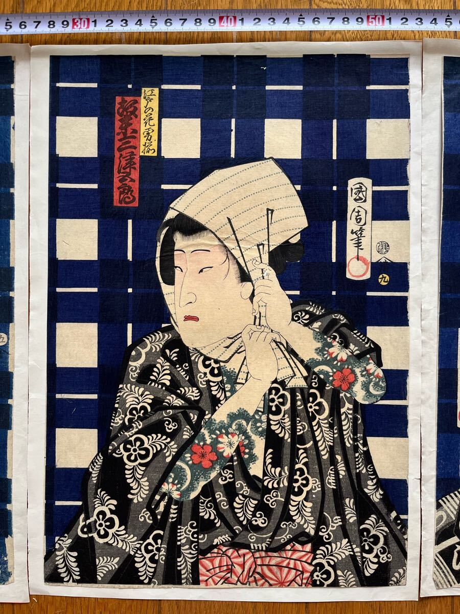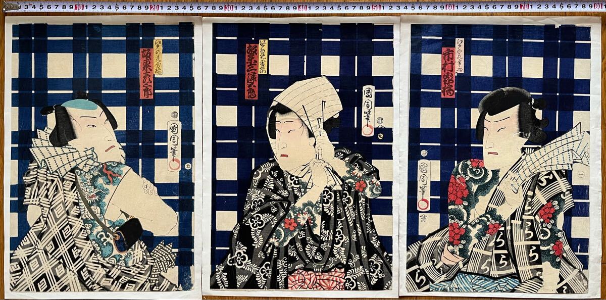 【真作】全刺青!本物浮世絵木版画 豊原国周「江戸の花勇み揃 坂東三津五郎」江戸期 役者絵 歌舞伎絵 錦絵 大判 三枚続 保存良い 裏打ち