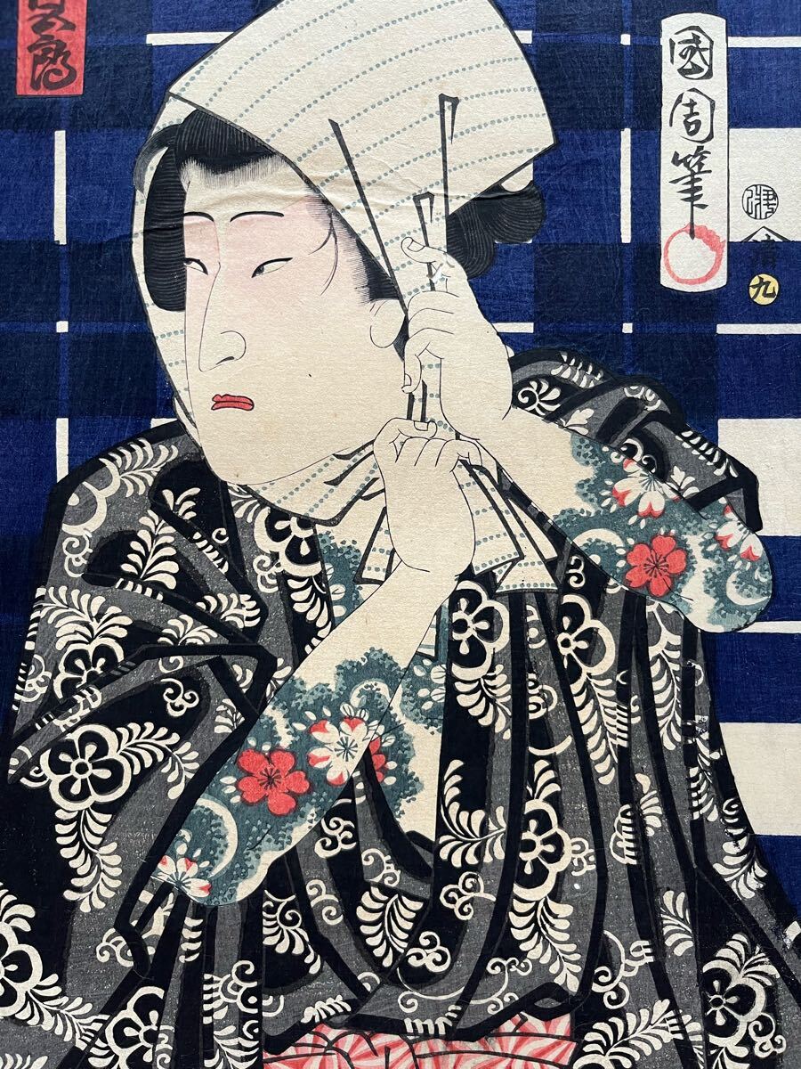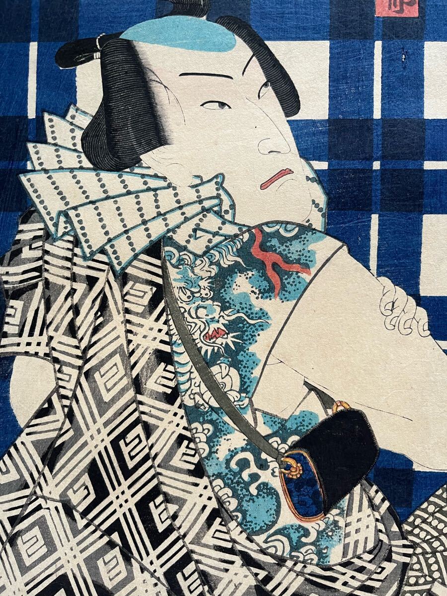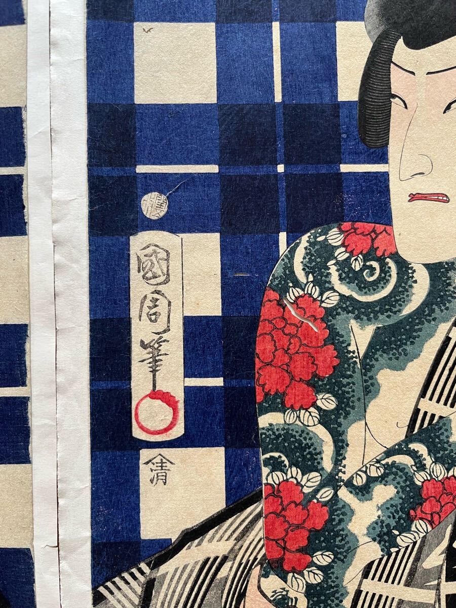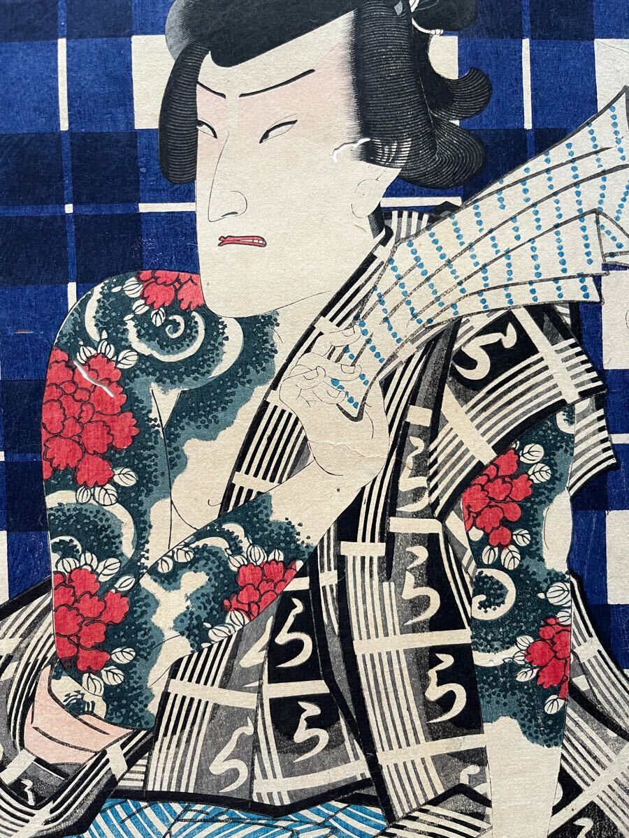 【真作】全刺青!本物浮世絵木版画 豊原国周「江戸の花勇み揃 坂東三津五郎」江戸期 役者絵 歌舞伎絵 錦絵 大判 三枚続 保存良い 裏打ち