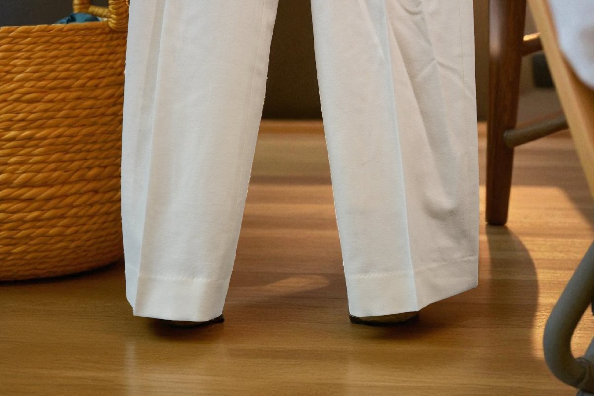 2タックでウエスト下にゆとりがあり、裾に向けてやや細身になるテーパードシルエットパンツ。