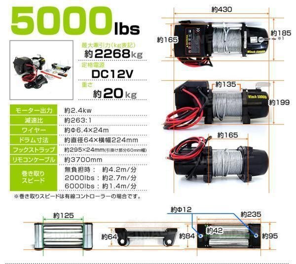ジェットスキー、ボートや重量物を引き上げる際にとても便利な電動ウインチです。 カー電源対応!車のDC12Vバッテリーに繋げて使用します。 無線リモコン付きなので、車両から離れてのウインチコントロール、牽引対象物側でのウインチコントロールが可能です。 半永久的使用可能なマグネット式モーターを採用。 ※本製品は水平に牽引する仕様のものです。上下の荷揚げはできません。 【商品仕様】 ・巻き上げ重量:5000LBS(2268kg) ・定格電圧:DC12V ・ギア比:263:1 ・モーター:永久磁石 2.4kw ・ケーブル(約):直径 6.4mm、長さ 24m ・ドラムサイズ(約):直径 64mm、長さ 224mm ・サイズ(約):長さ420×幅153×高さ195mm ・重量(約):20kg ・防水仕様 【商品内容】 ・本体 ・コントローラー ・無線リモコン ・ガイドローラー ・取り付けボルトナット ・英語版取扱説明書 ※日本語取扱説明書は付属しておりません。 |