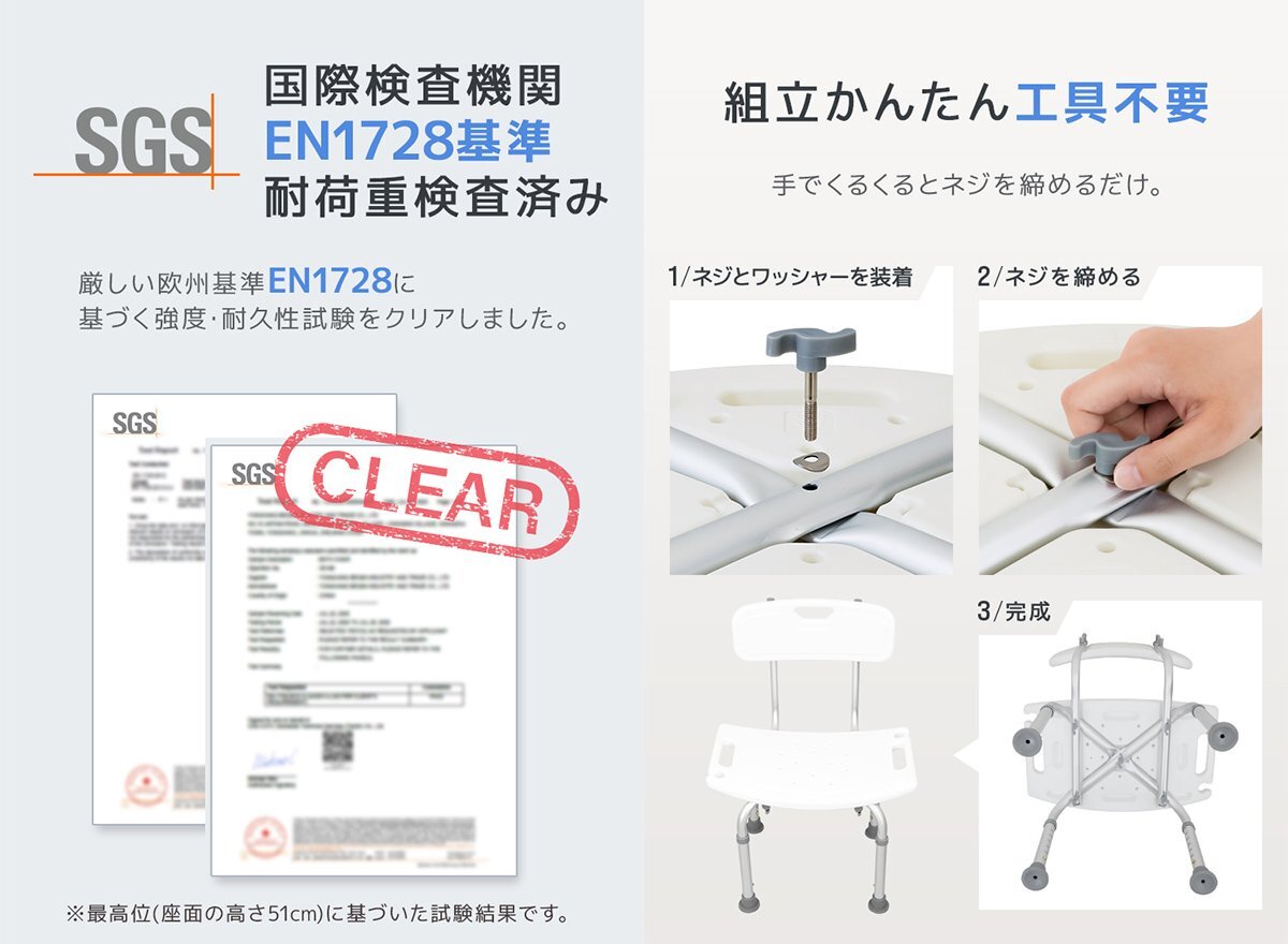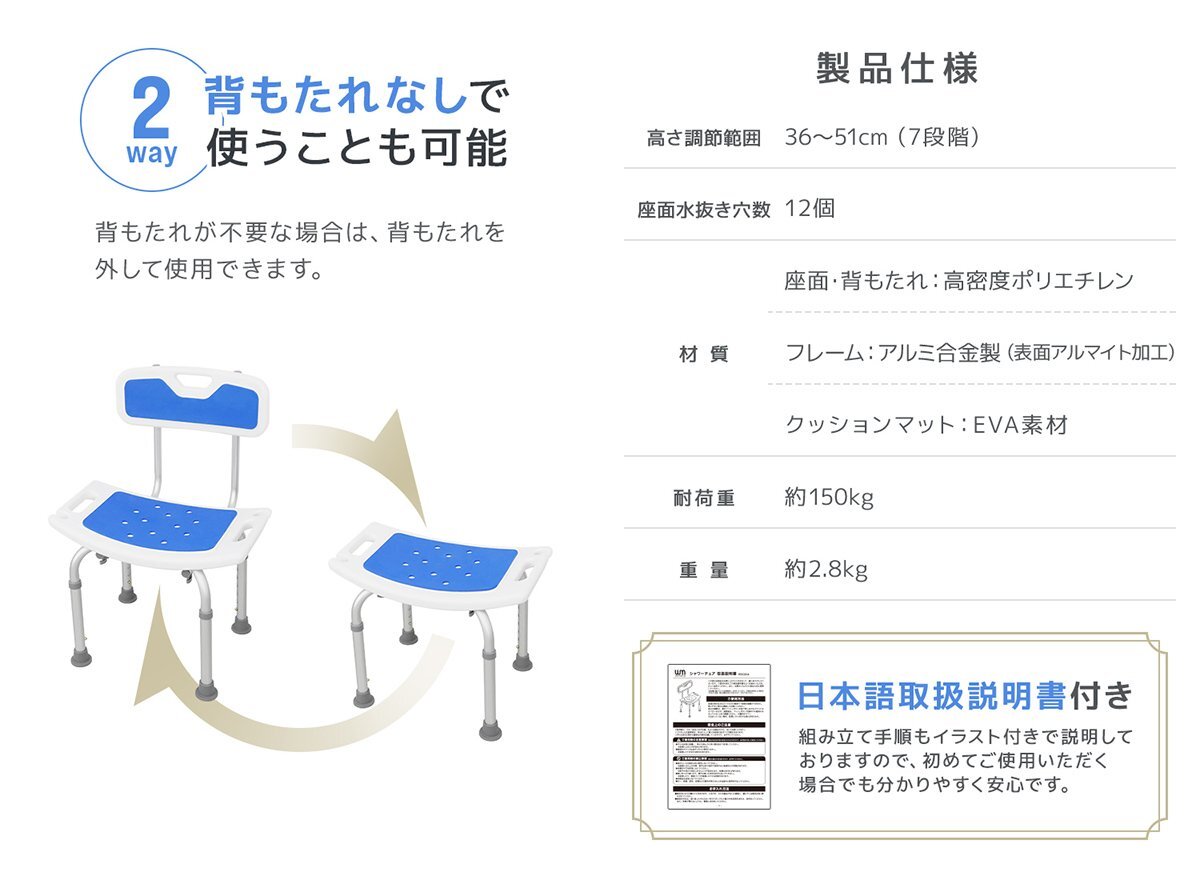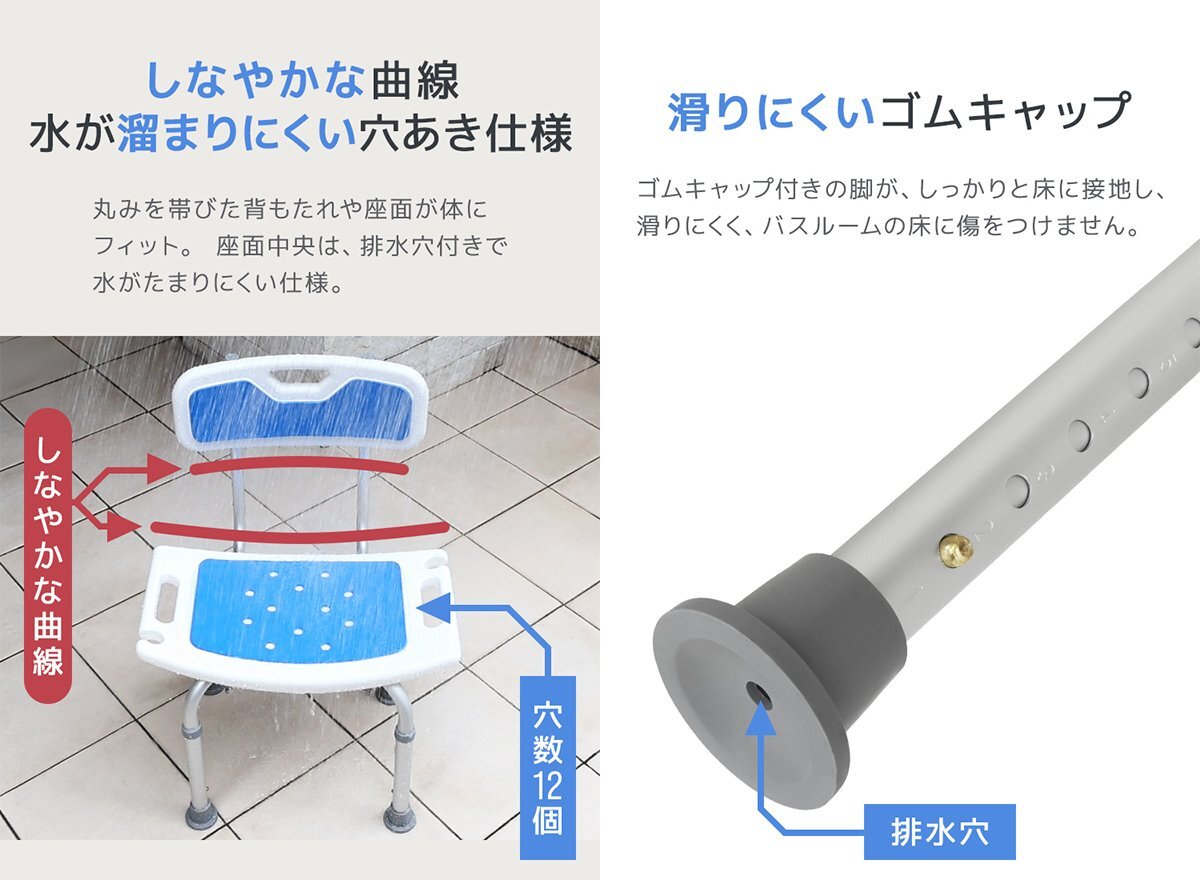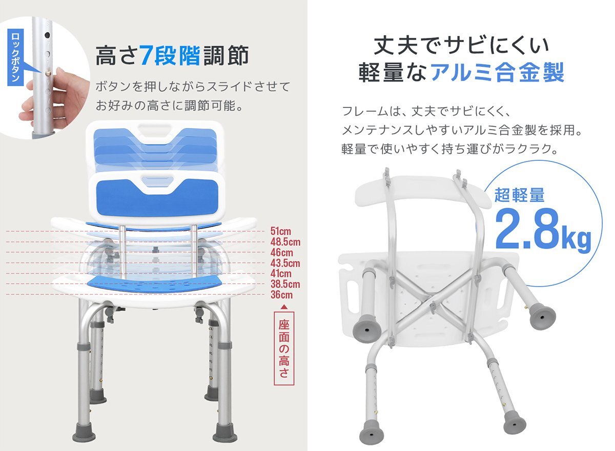 シャワーチェア 背もたれ付き 座面の高さ 7段階調節 タイプA (クッションあり) |