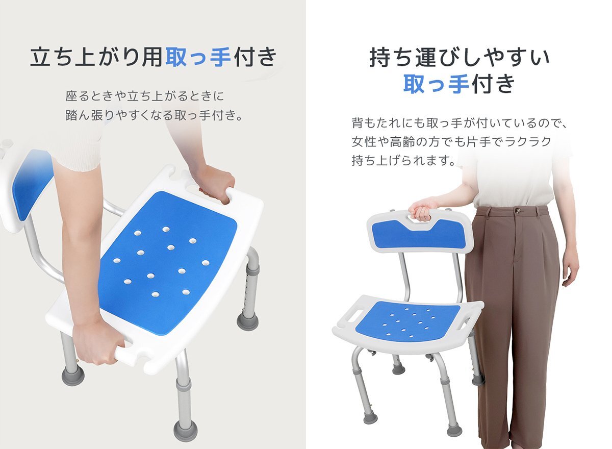 シャワーチェア 背もたれ・肘掛け付き 座面の高さ 6段階調節 クッションあり |