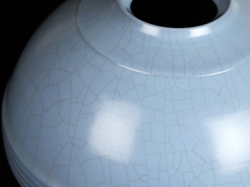 極めて色鮮やかな青磁の発色と細かく全体に纏った貫入が美しく、非常に洗練された風格と温かさを併せ持った実に魅力的な作行を示す。