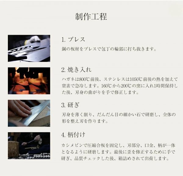 最上位クラスの品質を持つVG10ステンレスを高品質ステンレスで挟み込んで作られた刃は、プロも愛用するほどの素晴らしい切れ味を誇り、耐摩耗性に優れているため切れ味が長持ちします。