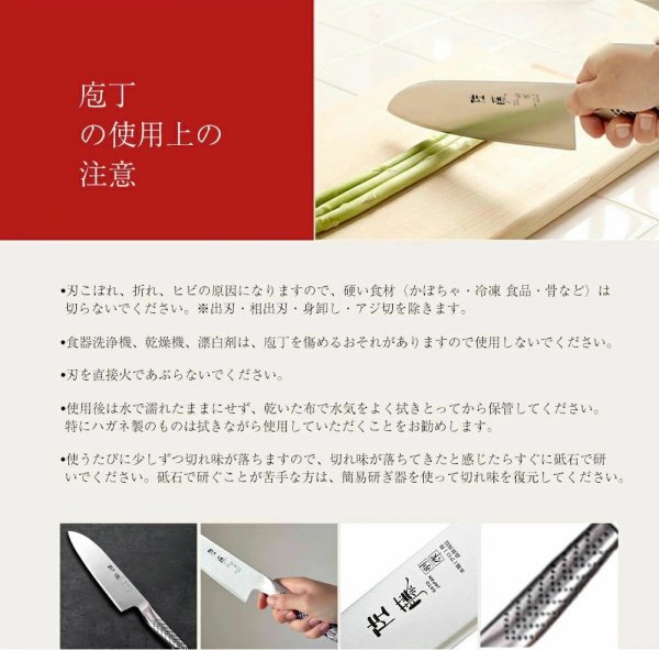 【日本刀のようなプロの切れ味】精密に薄く仕上げられた刃は、切断の抵抗を最小限に抑え、高い切れ味を実現します。刃の芯材にはステンレス最高峰ののV金10号、高級ステンレスを採用し、よく切れる包丁として高い評価を頂いています。VG10は非常に高い耐腐食性・耐摩耗性を誇るため品質が持続します。
