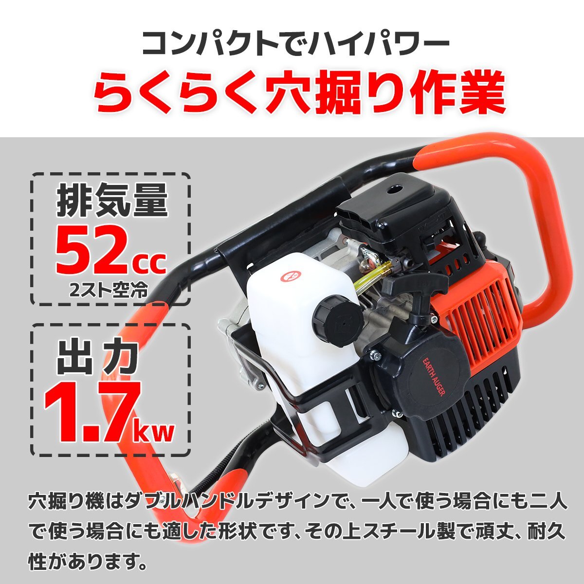 ★★80ミリドリルと100cm延長棒標準付属の52CCエンジン穴掘り機です。 ★両ハンドル式オーガなので一人でも二人でも作業がし易い! ★ハイパワーでΦ40mm~Φ300mmドリルまで装着可能です。 ★大き目の穴も、深い穴もかんたんに掘ることができます。 ★杭打ちや支柱打ち、水道電気などの工事等様々な場面で大活躍! 【商品仕様】 エンジン:52cc 空気冷却式 2ストローク エンジンパワー:1.7kw シャフト径:Φ20mm 推奨ドリルサイズ:Φ40mm~200mm 回転速度:6500rpm-7000rpm 燃料:混合ガソリン(25:1) 燃料タンク容量:1200ml 本体重量:(約)8.0kg 本体サイズ:520×240×320mm ドリルサイズ:Φ80mm×長さ790mm 延長棒長さ:100cm 【商品内容】 工具一式、 混合ボトル容器、 漏斗、 80ミリドリル、 100cm延長棒、 英語版説明書 | |