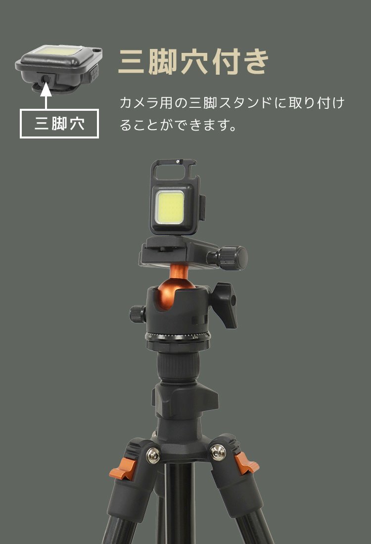 軽量でコンパクトサイズなのに、圧倒的な明るさ! 広範囲を照らす高輝度COBチップ搭載LEDライトです。 ご使用の場面に合わせて4つの点灯モードを選べます! 明るさ3段階+点滅モードの4パターンがワンタッチで簡単に切替できます。 小雨程度なら気にせず使える生活防水性能。 充電式なので場所を選ばずどこでも使用でき、USB充電対応でモバイルバッテリー等からも充電できます。 さらに充電しながら使用できるので、急な充電切れでも安心です! スタンドやマグネット、カラビナ、三脚穴付きで様々な取り付け方に対応します。 \いろいろなシーンで大活躍/ ・キャンプやアウトドア ・夜釣り ・登山 ・ランニング ・車やバイクの修理、整備 ・夜間の読書など ・災害時や停電時 …等々 【商品仕様】 サイズ:(約)横4.7cm×縦6.2cm 重量:(約)43g 全光束:1000lm(強モード・点滅モード) 材質:アルミ合金、PC (LEDライト LED投光器 ハンディライト 野外灯 看板灯 防犯灯 防水 USB Type-C キーホルダー 散歩 防災 人気 おすすめ 送料無料 WEIMALL) |