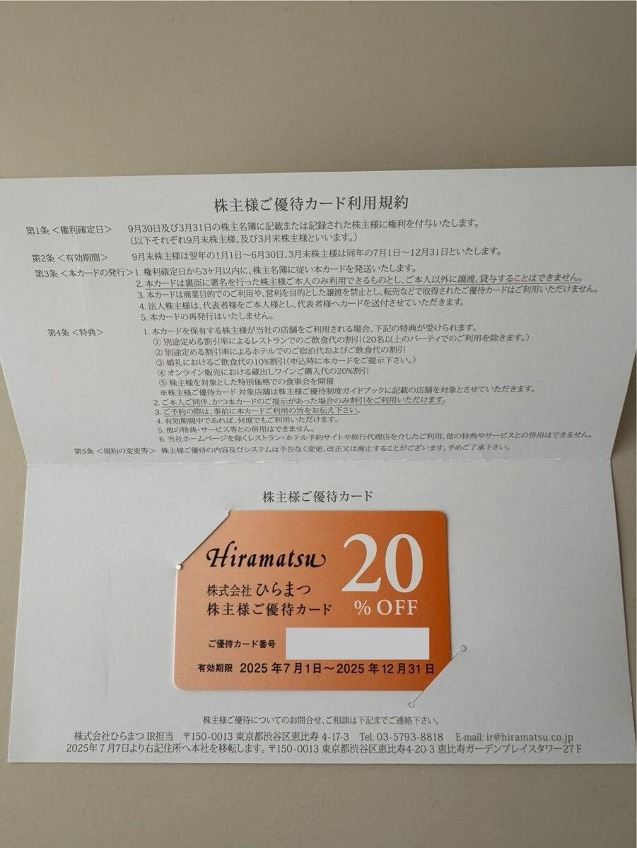 ひらまつ20%OFF株主優待カード1枚です。