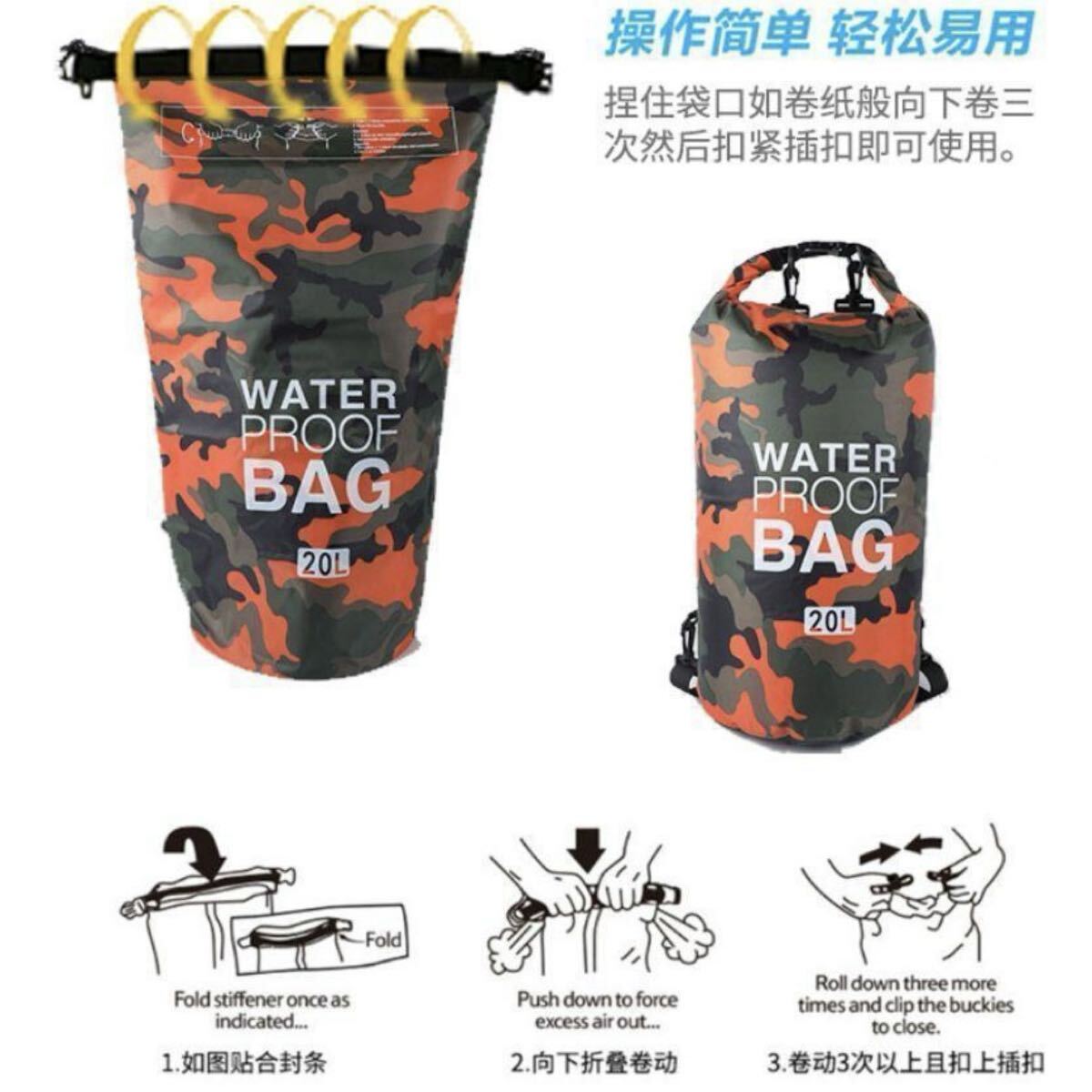 使用時には筒状の形状になり、開口部を2~3回程度丸め込んでバックルで両側から固定することで、水の侵入を防ぎます。