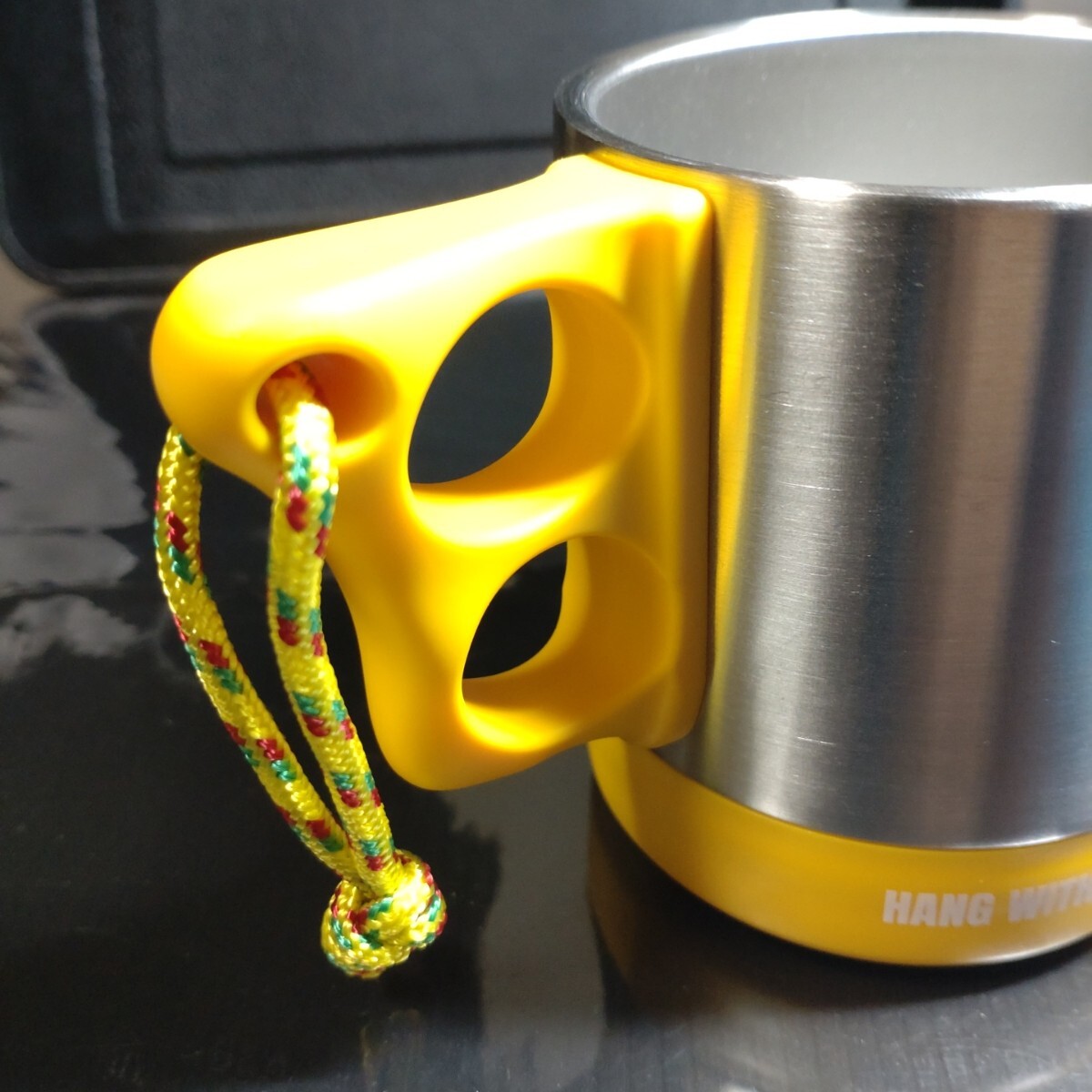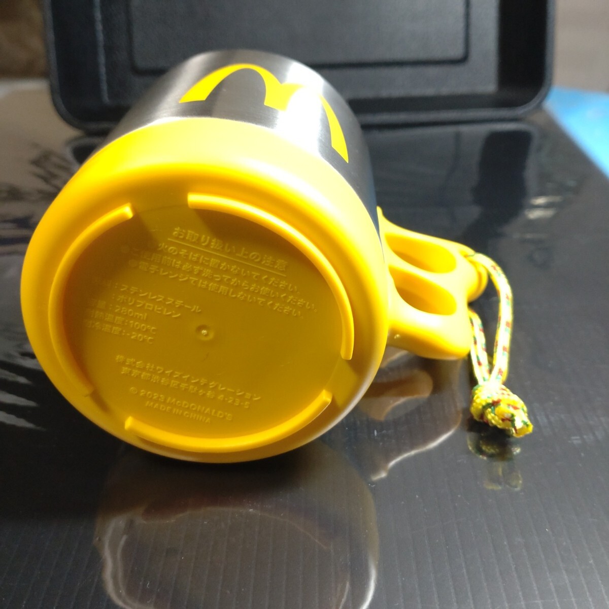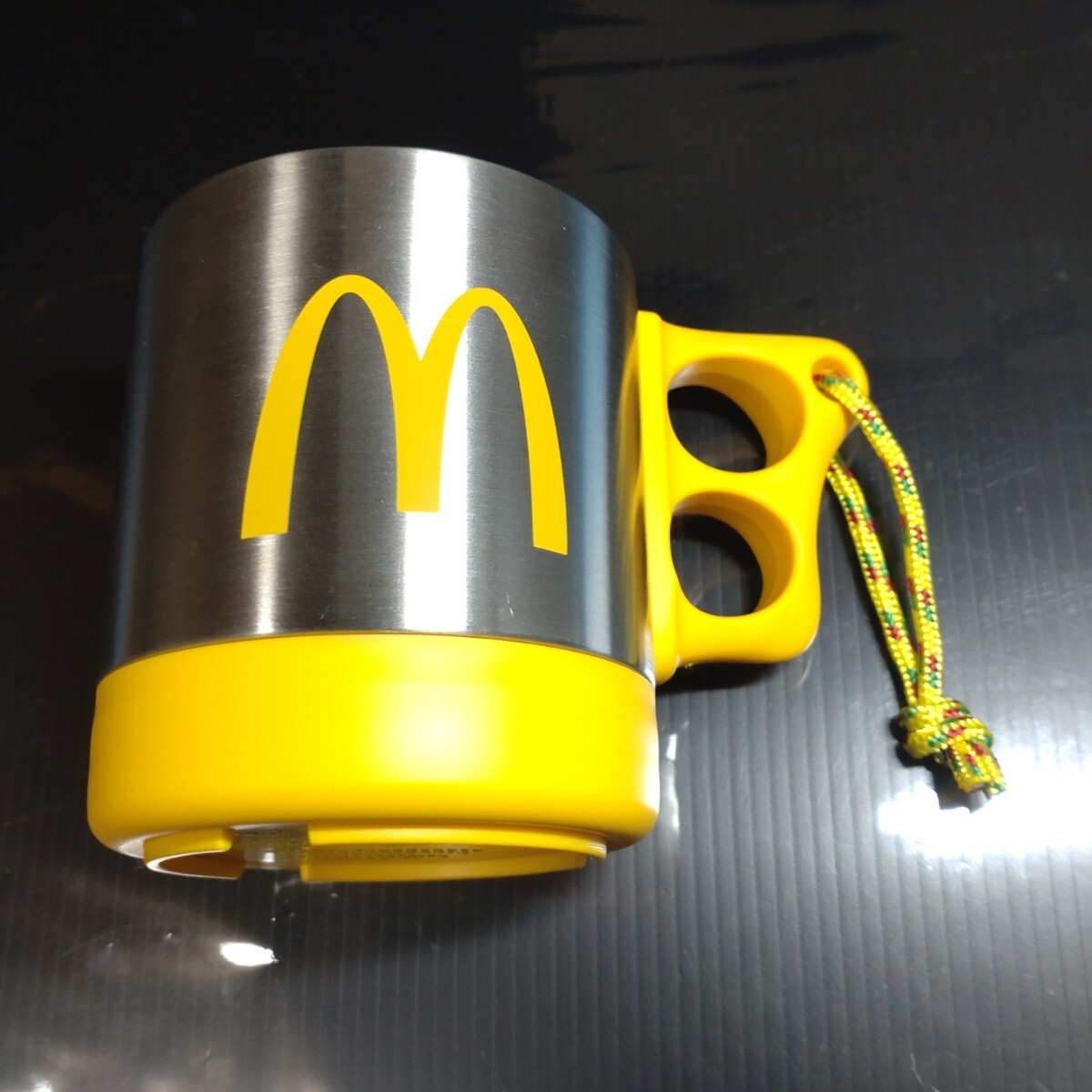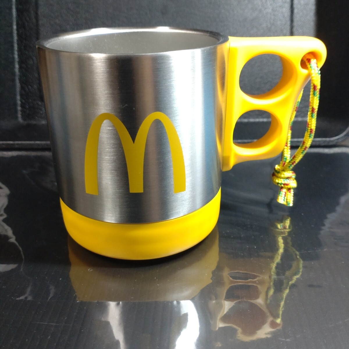 シルバーとイエローのデザインで、ペンギンロゴとマクドナルドのロゴが特徴的なマグカップ。