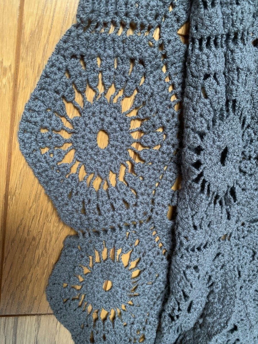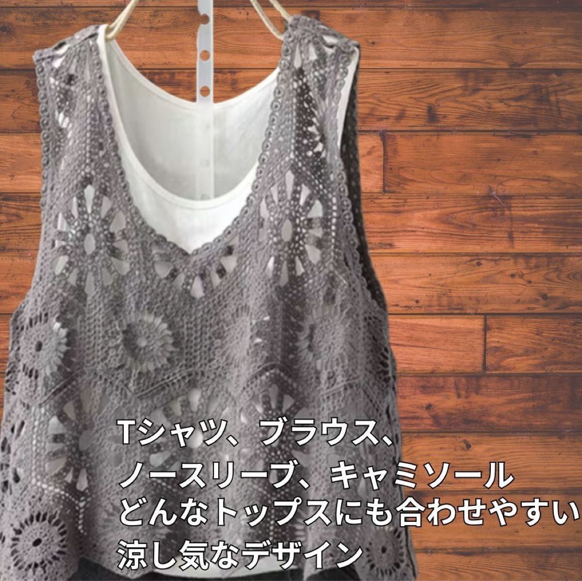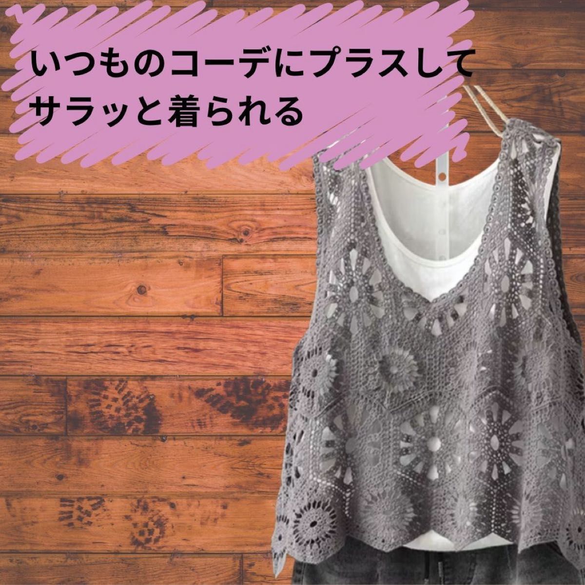 落ち着いたグレーが上品な印象の、レディース クロシェ編みベスト。