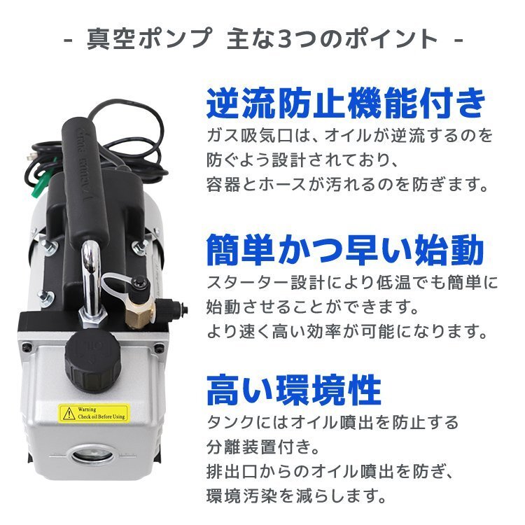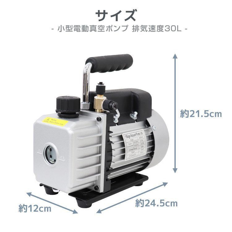 小型で使いやすい電動真空ポンプです。 カーエアコン、家庭用エアコンの真空引きに対応できます。 オイル逆流防止機能がついているのであらゆる冷媒に対応しており、幅広い用途に使えます。 R12、R22、R134a、R502などに対応。 【仕様】 ローター方式:シングルステージ式 到達真空度:75ミクロン(10pa) 排気速度:30 l/min(50Hz)、36 l/min(60Hz) 電源:AC100V(AC110V) 50Hz/60Hz 消費電力:120W 回転数:1440rpm(50Hz)、1720rpm(60Hz) 吸気口径:1/4"フレア(UNF7/16-20) サイズ:W115×D240×H230mm 重量:約6kg 逆流防止:あり イル封入量:160ml 【内容】 本体 真空ポンプオイル 英文取扱説明書 (真空ポンプ エアコン 電動真空ポンプ 小型 シングルステージ 冷媒 エアコン クーラー 真空引き 真空 ポンプ 電動 自動車 カーエアコン ルームエアコン 修理 人気 おすすめ ) |
