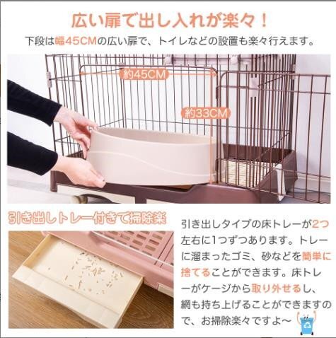 • 【大きく扉】天井と一番下の扉が大きく開くので、お世話がしやすいです。出入口が広く、おもちゃの出し入れや猫ちゃんの出入りもラクラク。※3段はちょっと高いので、天井は2段タイプでご利用におススメ。