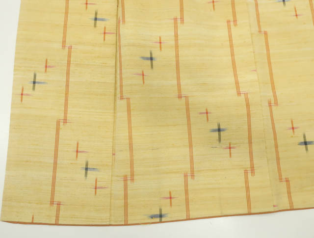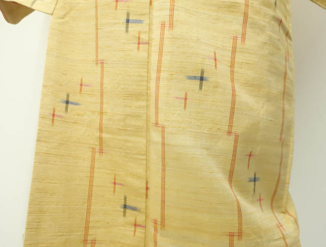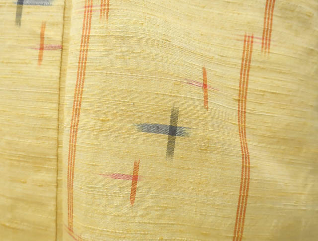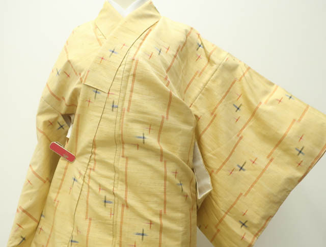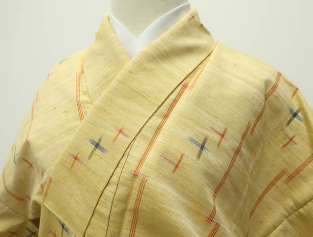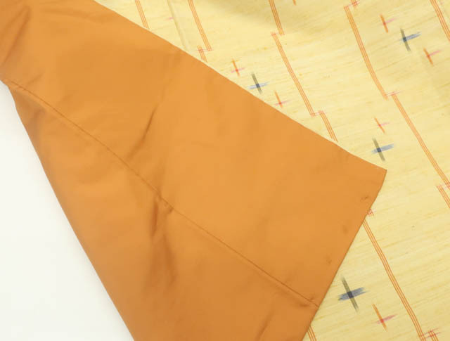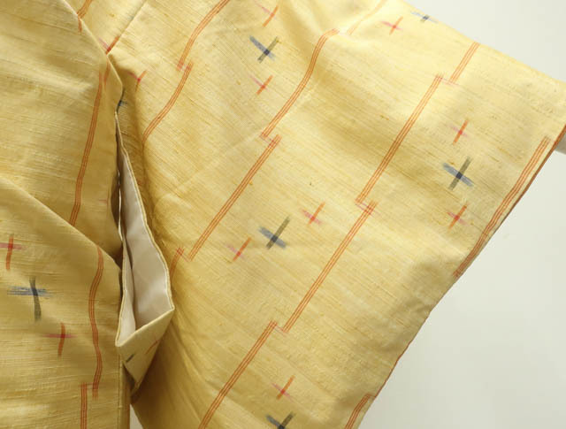 リサイクル商品のため、胴裏にスナップボタンによる汚れがございますがご着用いただけると存じます。 地色は、黄色です。 1枚目の画像が近いお色かと思われます。 素材は正絹です。 |