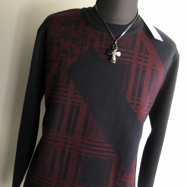 ■前身頃にチェック柄とランダムな千鳥柄を幾何学的に配したインパクトのあるクルーネックニット