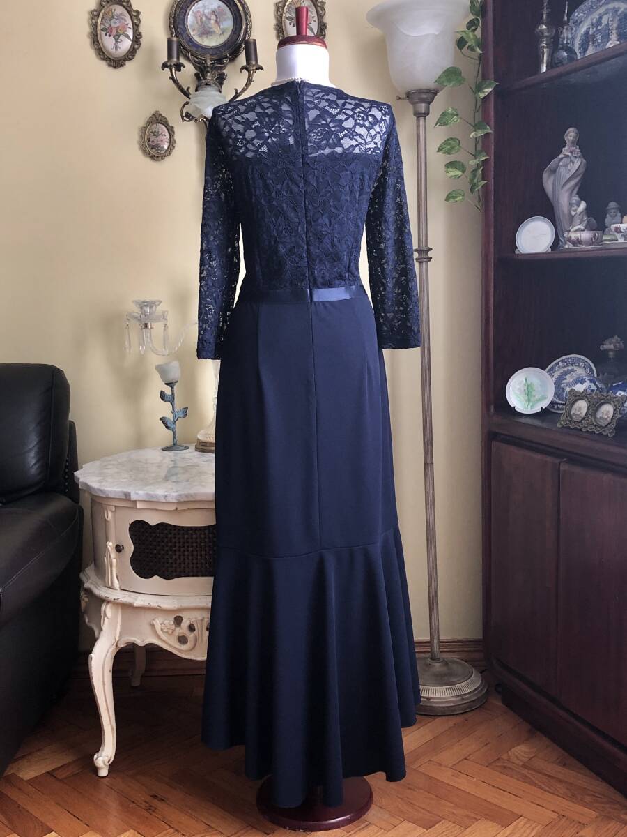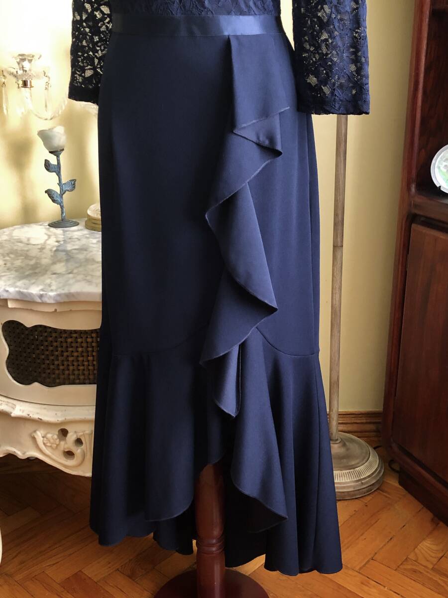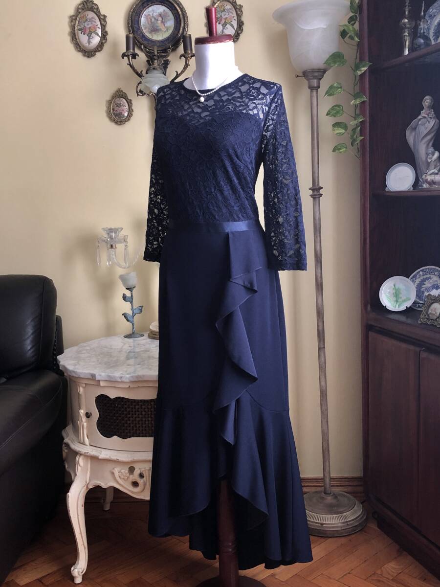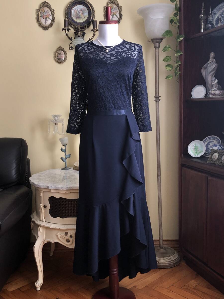 【MISSMNY】より、素敵なレースのカクテルドレスです。 お花柄のストレッチレースが綺麗です。 ラッフルがトリムされたマーメイドスカートも素敵ですね。 ウエストのリボンもストレッチします。 ストレッチスムースの裏地が付いています。 後ファスナーで開きます。 【状態】新品 【ブランド】MISSMNY 【サイズ】表示サイズ/us(アメリカ)XL 日本対応サイズ目安/ 17号サイズぐらい *個人差がございます。必ず採寸をご参照ください。 【採寸】平置き採寸です。 肩幅41㎝、身幅50㎝、ウエスト42cm、着丈後最長143㎝(上身丈41㎝+リボン幅2㎝、スカート丈後最長100㎝) *ストレッチします。 【カラー】濃紺 【素材】ポリエステル94%、エラスタン6% ポリエステル95%、エラスタン5% 【裏地の素材】ポリエステル100% 【着脱】後ファスナー |