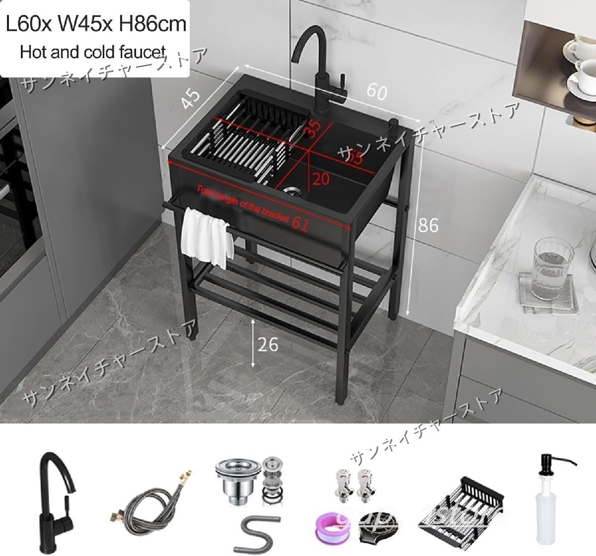 全体のサイズ:高さ86cm*長さ60cm*幅45cm。 シンクの内部寸法:長さ55cm*幅35cm*深さ20cm;