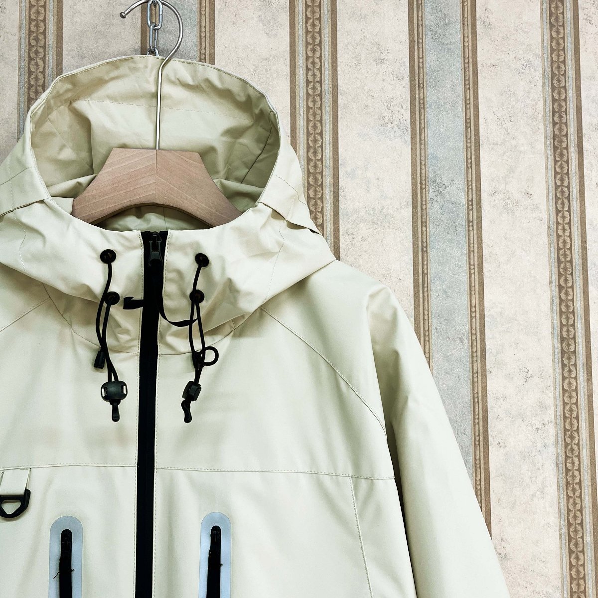 無地のシンプルデザインにフードをプラスし、幅広いスタイルにマッチ。フードと裾にはドローコード付きで、身体にフィットさせることで風や雨の侵入をしっかりガード。胸元には反射テープを施し、夜間の視認性を高めて安全性も確保しています。