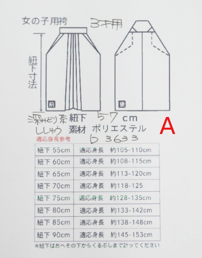 女の子の袴 の販売です お気に入りの着物とコーディネイトしてください。 こちらのお品物は特に目立つ汚れ等はありません。 洋装も可愛いですが、日本の伝統美着物でお祝いしてくださいね♪ 七五三、お正月、節句など お祝い着として是非おススメです♪ セット内容は画像をご確認ください。 未使用品ですが経年による汚れやヤケなどがある場合があります。 気になる方は入札をお控えください。 返品交換はお受けできませんので予めご了承の上ご入札は慎重に行って下さい。 素材:一番最後の画像をご参照ください。 サイズ:一番最後の画像をご参照ください。 子ども着物特集ページはこちら ↓↓↓↓↓↓↓↓↓↓↓↓↓↓ 【出品中!!!!】 ※検品のうえ商品の状態をランクで記載しておりますが、 見落としによるシミや汚れがある場合がございます事をご了承下さい。 ◇参考サイズ◇ 身長 袴丈(紐下) 80cm ==35-40cm 1才前後 95-100cm==45-50cm 3才前後 110cm ==55-60cm 数え5才前後 115cm ==60-65cm 満5才前後 120cm ==65-70cm 6-7才前後 ※身長と袴丈の関係はあくまでも目安で個人差があります。 ※色の出方が異なる場合があります。 ※お使いのディスプレイによっては実物の色と違って見える場合がございますので、予め御了承ください。 | |||