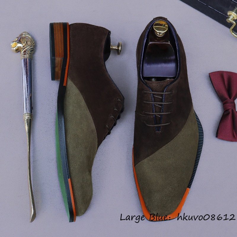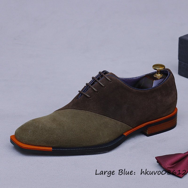 超美品■本革 レザーシューズ メンズ ビジネスシューズ 紳士靴 職人手作り 牛革 スエード革 切替 革靴 イギリス風 通勤 オリーブ 24.5cm