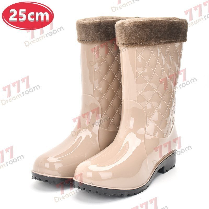 1スタ☆お洒落 キルティング レインブーツ ボアインナー付 【ベージュ 25cm】 長靴 レディース 女の子 梅雨 K-312