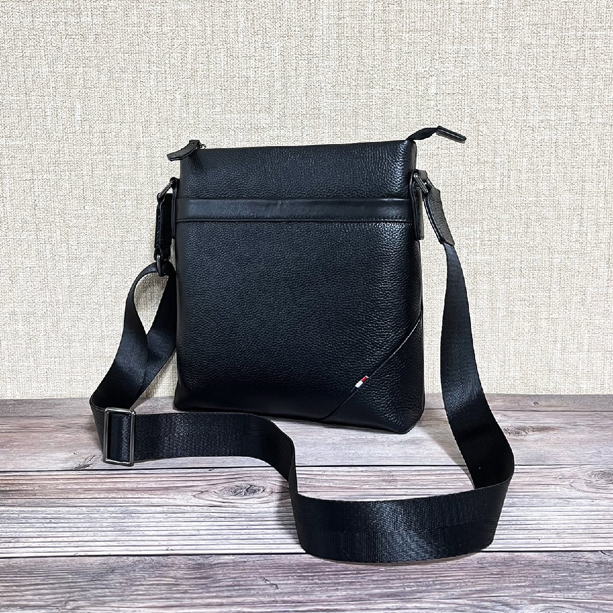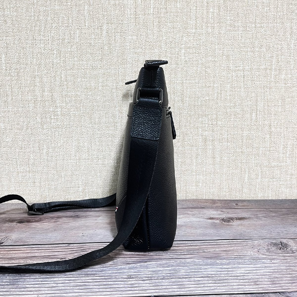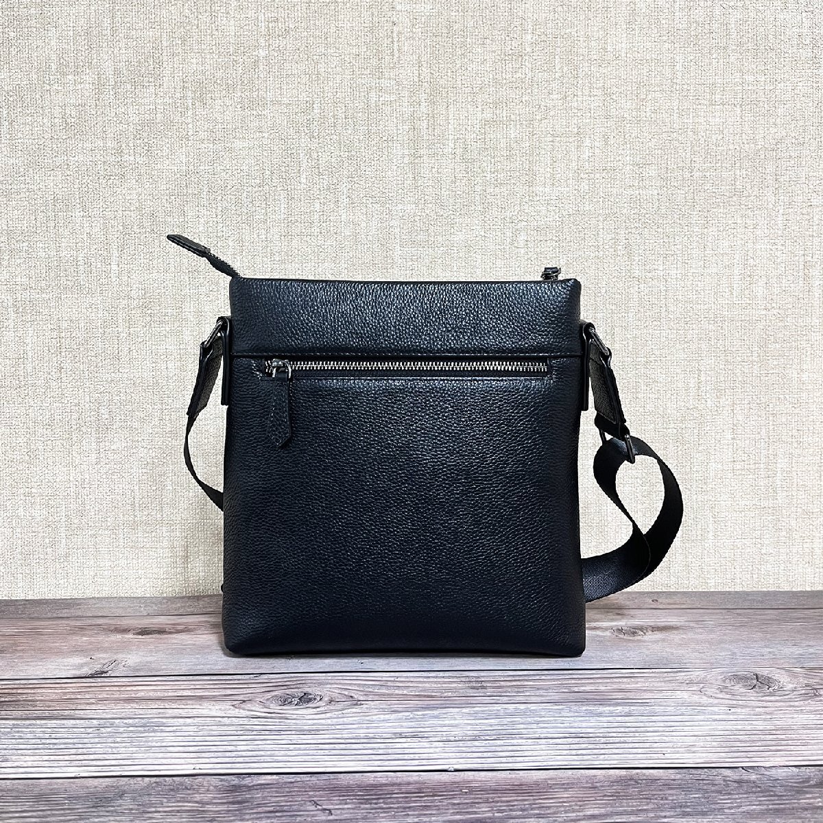 定番のブラック色使いにすることで、機能性だけでなく細かなデザインにもこだわっております。開閉口はファスナーにより大事な物の紛失を防ぐことができます。コンパクトなレザーバッグですが、ファスナーポケットなども装備され、収納力がけっこうあります。スマホ、鍵などいつも持ち歩く身の回りにの物をすっぽり入ります。