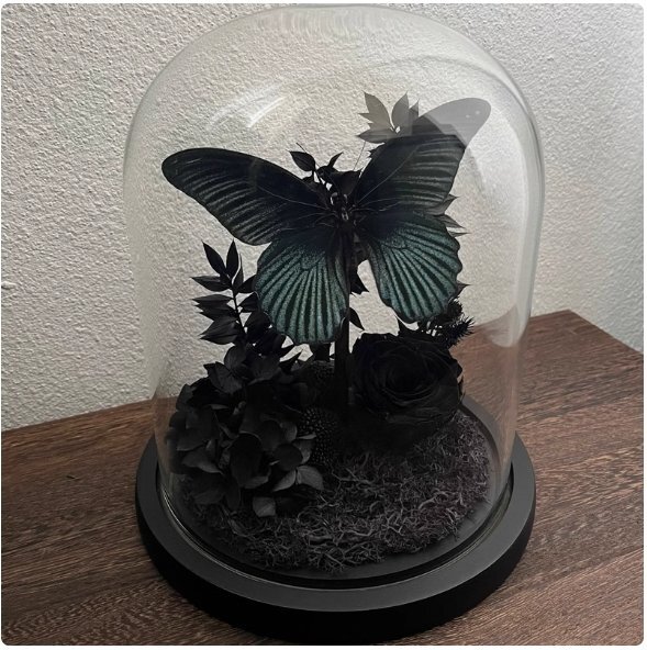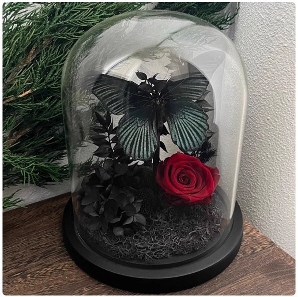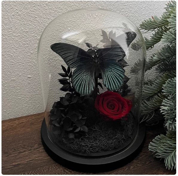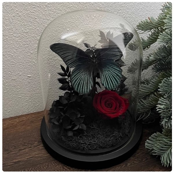 青と黒の美アゲハ蝶真蝶標本永遠の花赤バラガラスカバー置物