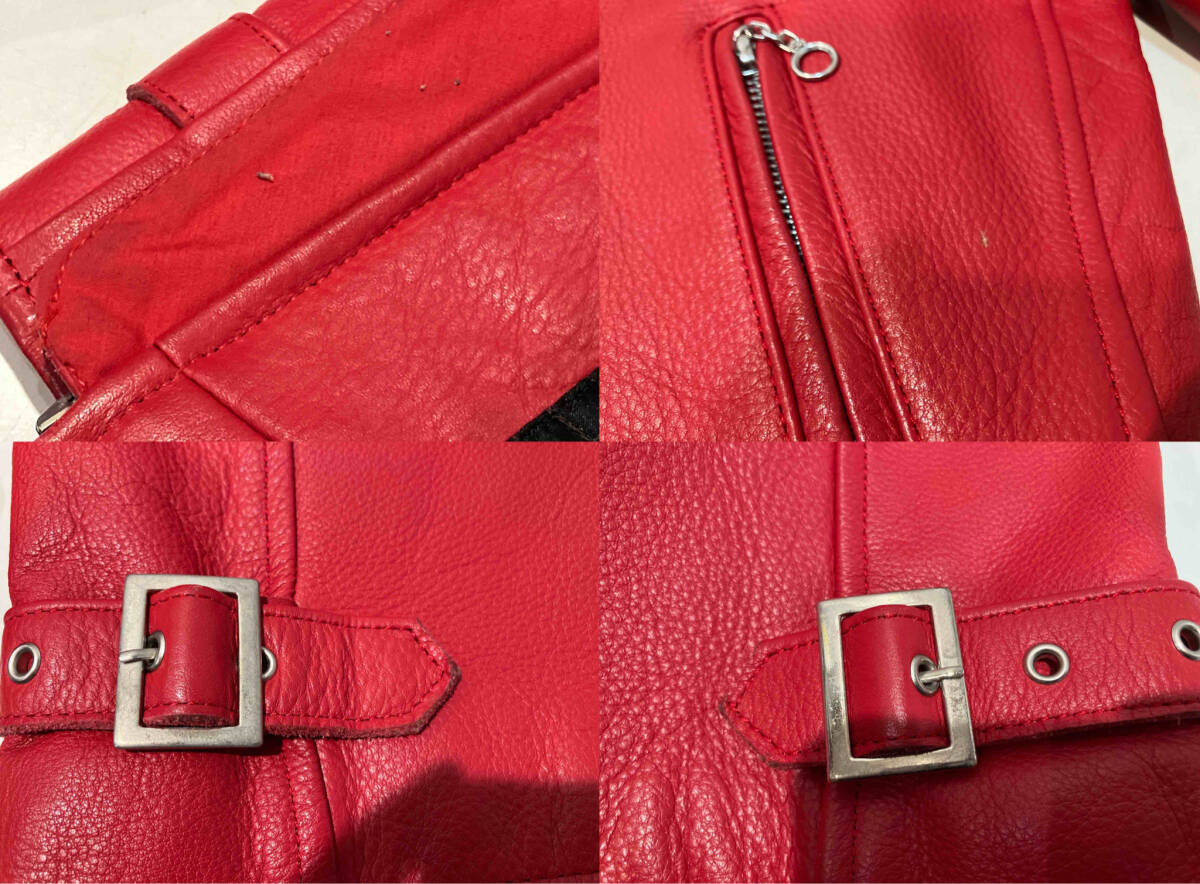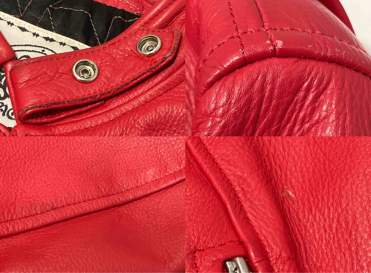 着丈:約60cm 袖丈:約59cm 身幅:約52cm 肩幅:約44cm 状態:全体的に使用感とスレキズあり(写真参照) 襟周り、袖周り、裾周り、 内側ファスナーのかぶせ部分にスレ、汚れあり |
