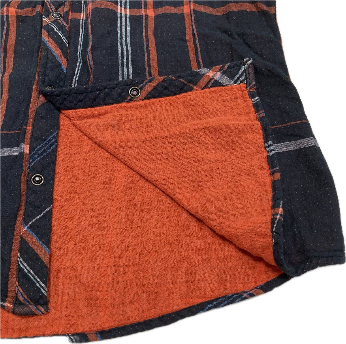 ■ワイドカラー、前6ハトメスナップボタン、袖口3ハトメスナップボタン、前肩と背に山切りヨーク、裾ラウンドカット、背に文字刺繍入りのウエスタンシャツです。黒ベースのチェックとオレンジ無地の2枚合わせガーゼ素材で出来ていますのでとても柔らかな肌触りです。
