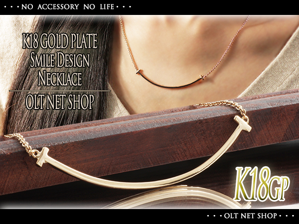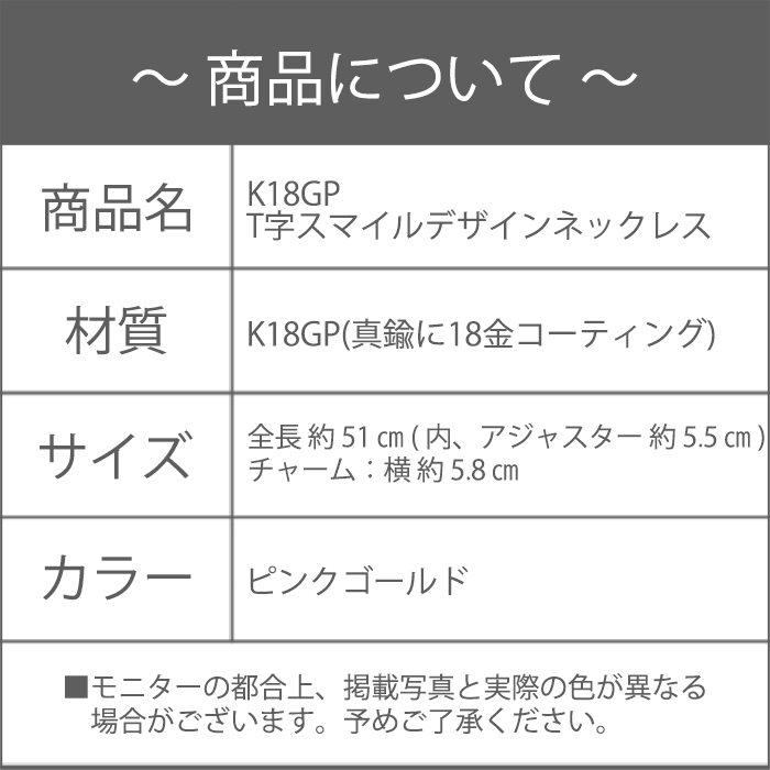 新品/ネックレス/K18GP/T字/スマイル/バー/18金/ピンクゴールド/レディース/チェーン/メタル/ライン/シンプル/上品/女性/PG