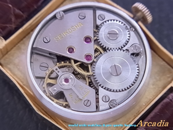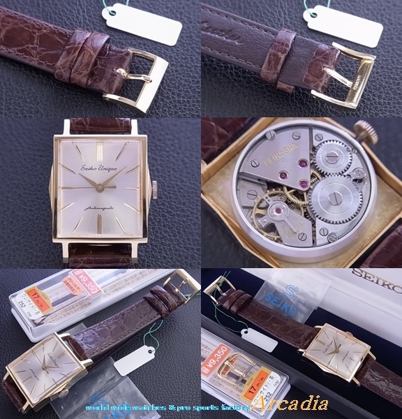 ◆1950年7月に諏訪精工舎で製造が開始された「SEIKO SUPER」の改良型として亀戸精工舎で1955年6月から製造が開始されました。同年8月には、国産初の自動巻式時計、通称「インジケーター」が亀戸精工舎で製造が開始されました◆ 諏訪精工舎の「SEIKO SUPER」に対し、亀戸精工舎「SEIKO UNIQUE」が其々の工場の1950年代の代表作です。諏訪精工舎「スーパー」のムーブメントの厚さがの5mmに対し、◎亀戸精工舎「ユニーク」は4.6mmと亀戸精工舎の技術の高さ覗われる逸品です。 ●本時計、製造開始当初の10石モデルは「耐震装置」がついておりません。また、通説ではユニークの石数モデルは、9石、15石、17石モデルの3モデルとされておりますが本時計は「最初期型10石仕様」のレアものムーブメントとなっており大変貴重な一品腕時計となっております♪ ゴールドスチール3針や彫ゴールドクサビ放射状筆記体文字盤には12時位置、6時位置それぞれプリント配置された独特な書体の黒筆記体文字が用いられ他の時計にはない魅力があり、大変雰囲気がある時計です♪ それにあいまって本時計の大変貴重な「◎角大型金張り14K GOLD FILLED側/ANTIMAGNETICアルミ管付きケース」が素晴らしく魅力的で当時としては丸型ケースが主流の中、超厚スクウェアプラ風防とあいまってこれも魅了される逸品腕時計となっております! 時代を感じる本時計は入手が大変困難な1950年代の完品デッドストックでオーバーホール済みの一品時計です♪(現在OH済み稼働中の一品ですが約70年前の腕時計ですので優しく扱ってください) 1955年6月亀戸精工舎製「SEIKO UNIQUE最初期耐震装置無し10石手巻 ◎角大型金張り14K GOLD FILLED側型/ANTIMAGNETICアルミ管付き」デッドストック品で、その時代のものとしては、状態も良く綺麗な時計です。付属品も充実しており、完品時計です。 ●付属品も販売店プライス用タグ・S/SEIKO防塵ビニール袋・新品MARUMAN製最高級茶革本クロコベルト(金色尾錠付き)・後期型SEIKOマークゴールドプリント高級時計用黒系木製内ケース/外紙スリープ(経年有)を完備した逸品です♪ 極超レアもの一品時計、1950年代中期(昭和30年)1955年6月亀戸精工舎製、大変魅力的なデッドストック品です! ご落札後、又はご購入後のメンテナンスも当店にお任せ下さい。 責任を持って対応させていただきます。 是非、この機会に貴方だけのこの1本を! |