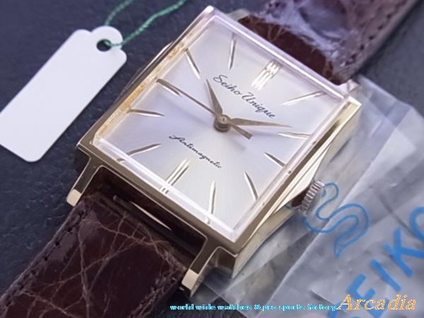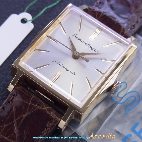 日本の古き良き時代の亀戸1950年代時計をご堪能下さい♪ SEIKO UNIQUE耐震無し10石手巻 金張り14K/GF側 デッド 角大型金張側彫クサビ文字盤1955年亀戸精工舎製! |