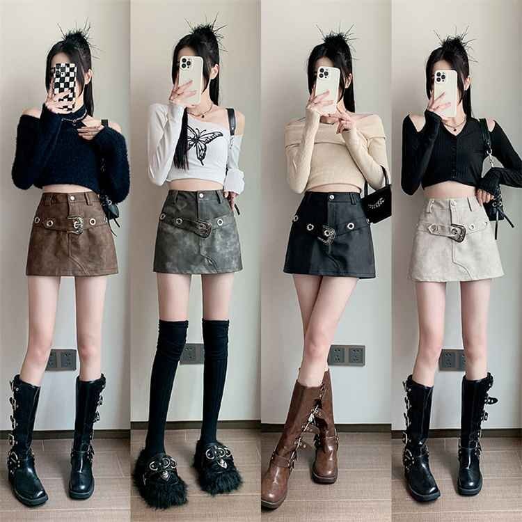 PUレザースカート ミニスカート Aライン ス力ート ミニ ハーフスカート 秋冬 XL ベージュ