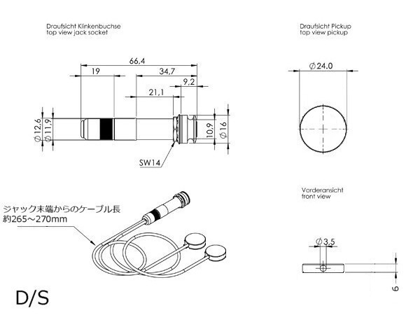 ※本品はジャック取付のために楽器本体への穴あけ加工が必要です。※カプセルデザインは幾度か変更されています。当方からご案内します本品のカプセルデザインは掲載画像のデザインとなります。 ※寸法図につきましてメーカー公表のものを参考に、カプセルサイズ、ケーブル長を実測したサンプル数値に変更しております。(ケーブル長には個体差がございます。)  ※ハイインピーダンス入力を備える機器に接続してご使用ください。※長時間取り付けたままにすると取付箇所に退色ムラが生じる場合がございます。また一般的に、両面テープの貼付により装着箇所に変質が生じる場合がございます。 お気になさる場合は本品の使用をご遠慮願います。※動作・状態確認のため、商品パッケージは一度開封いたします。