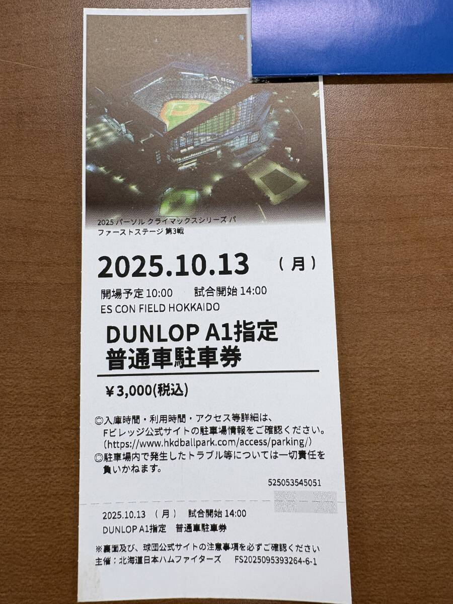 ☆エスコンフィールド DUNLOP PARKING A1 普通車駐車券の出品です。