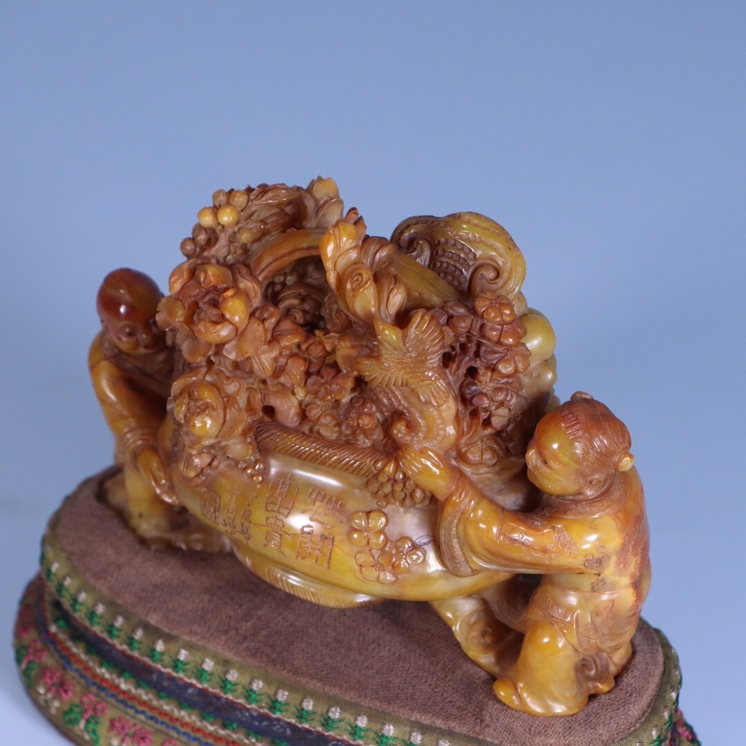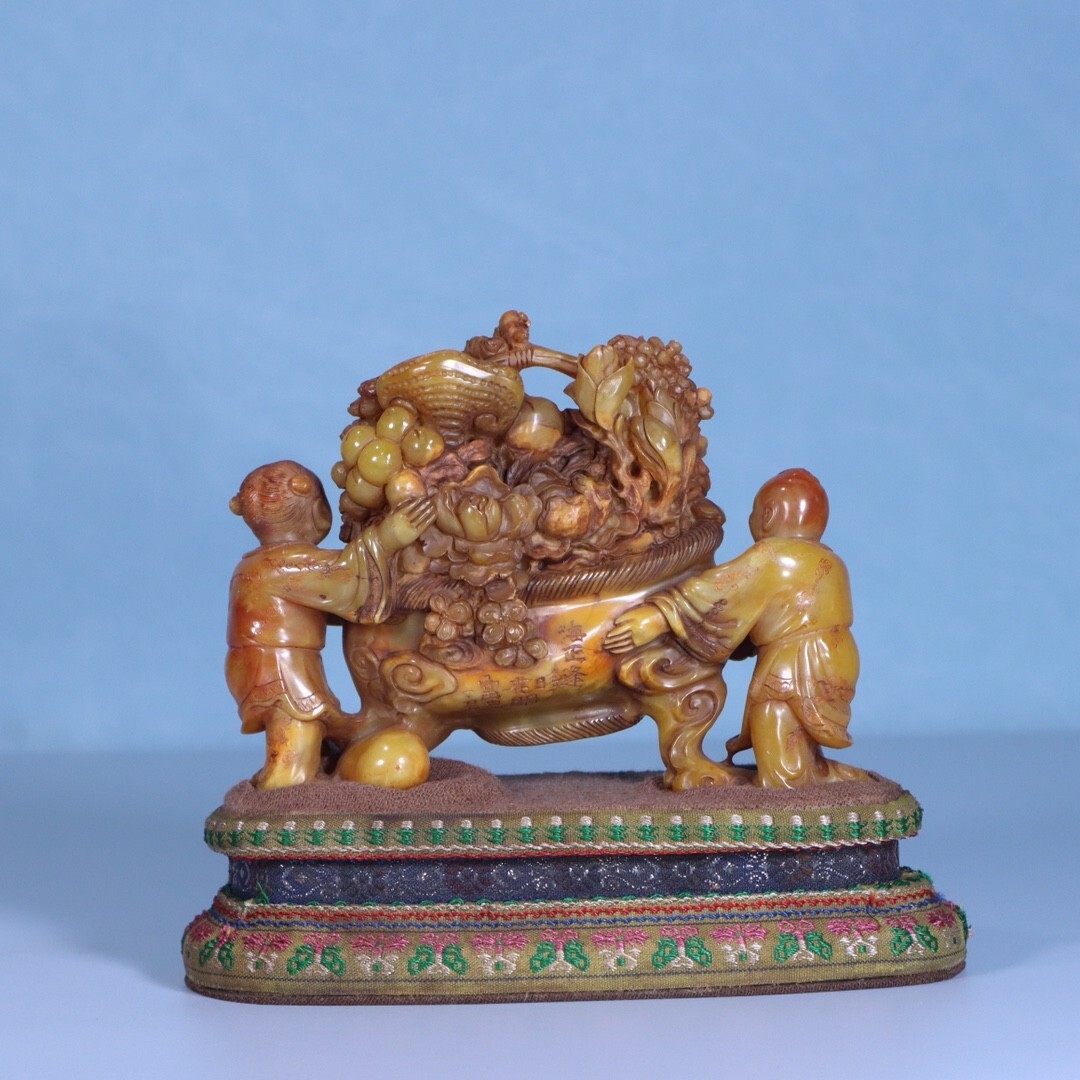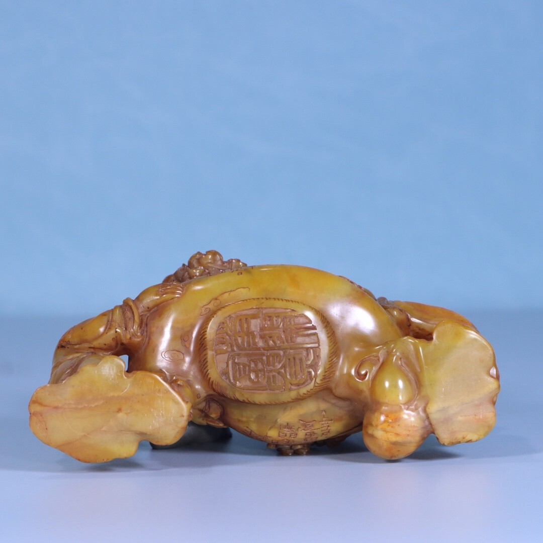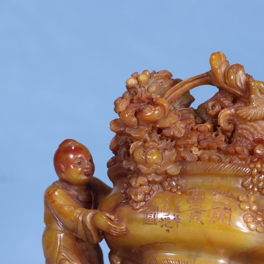 「清 高愷 老寿山石 田黄石彫り 花開富貴擺件」極細工 擺件 古賞物 中国古美術 旧蔵出