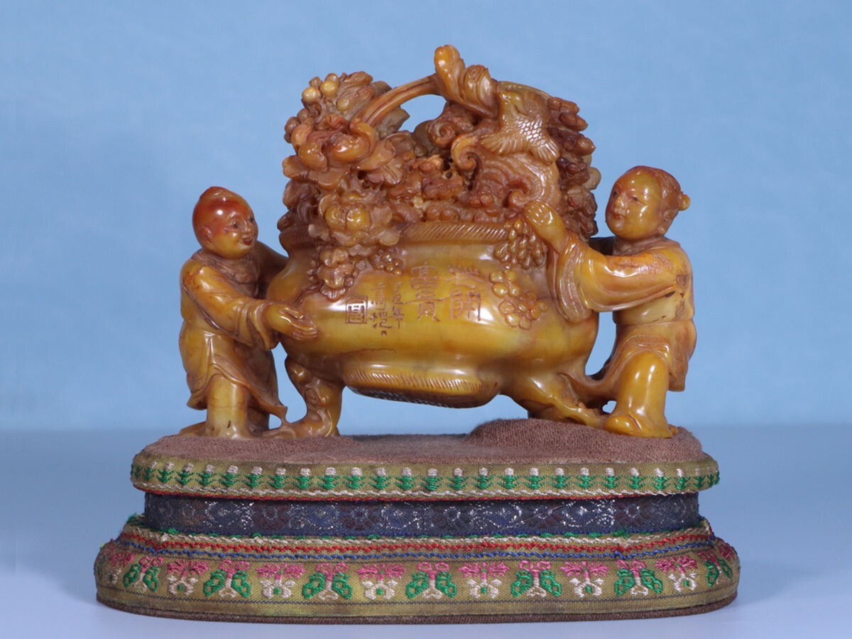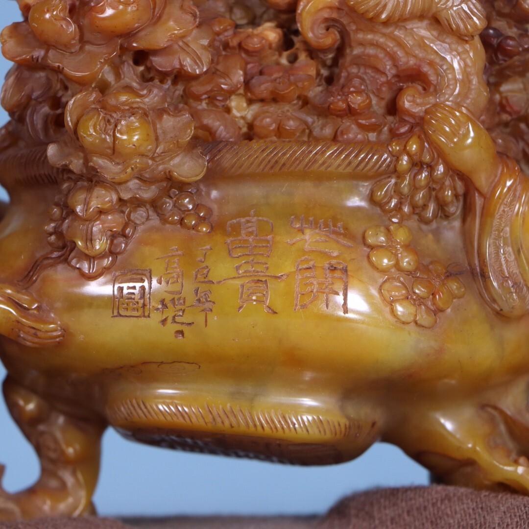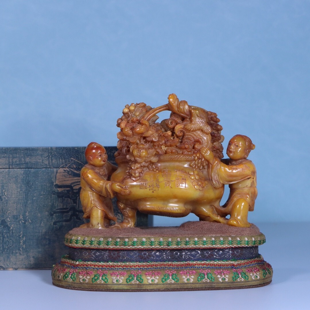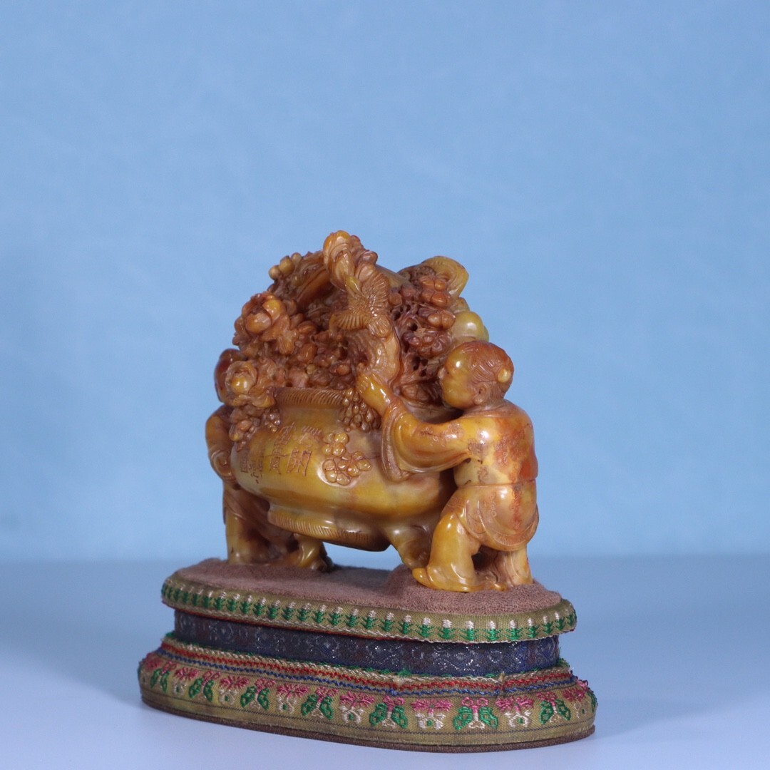 「清 高愷 老寿山石 田黄石彫り 花開富貴擺件」極細工 擺件 古賞物 中国古美術 旧蔵出