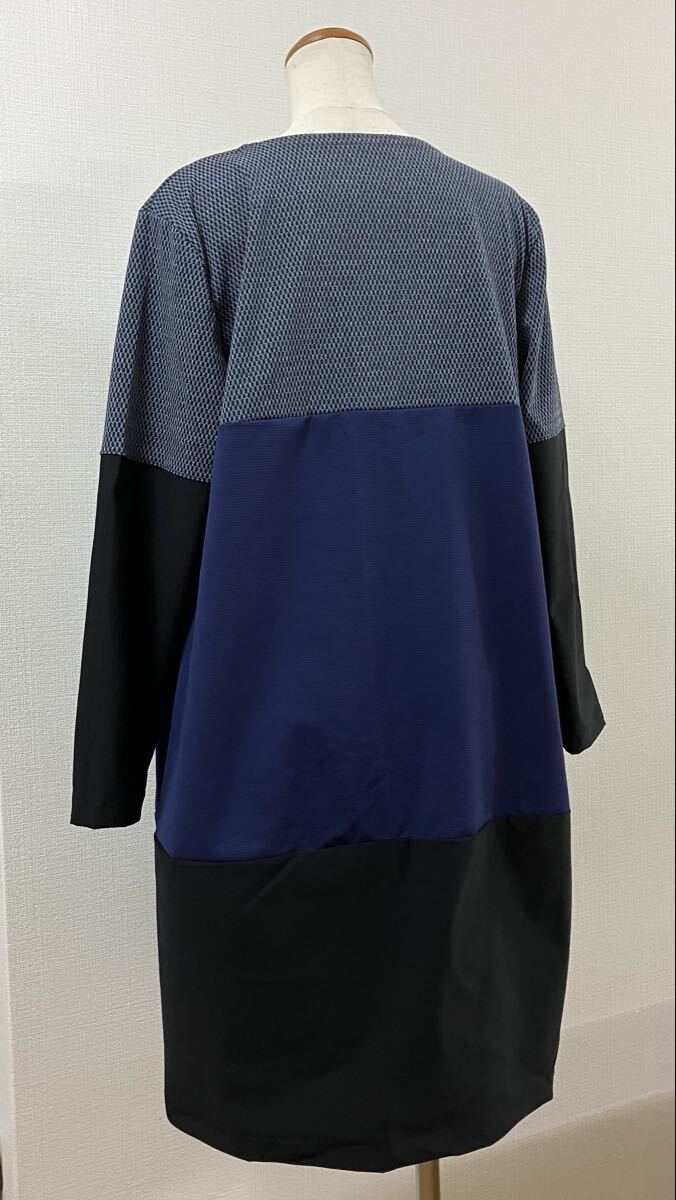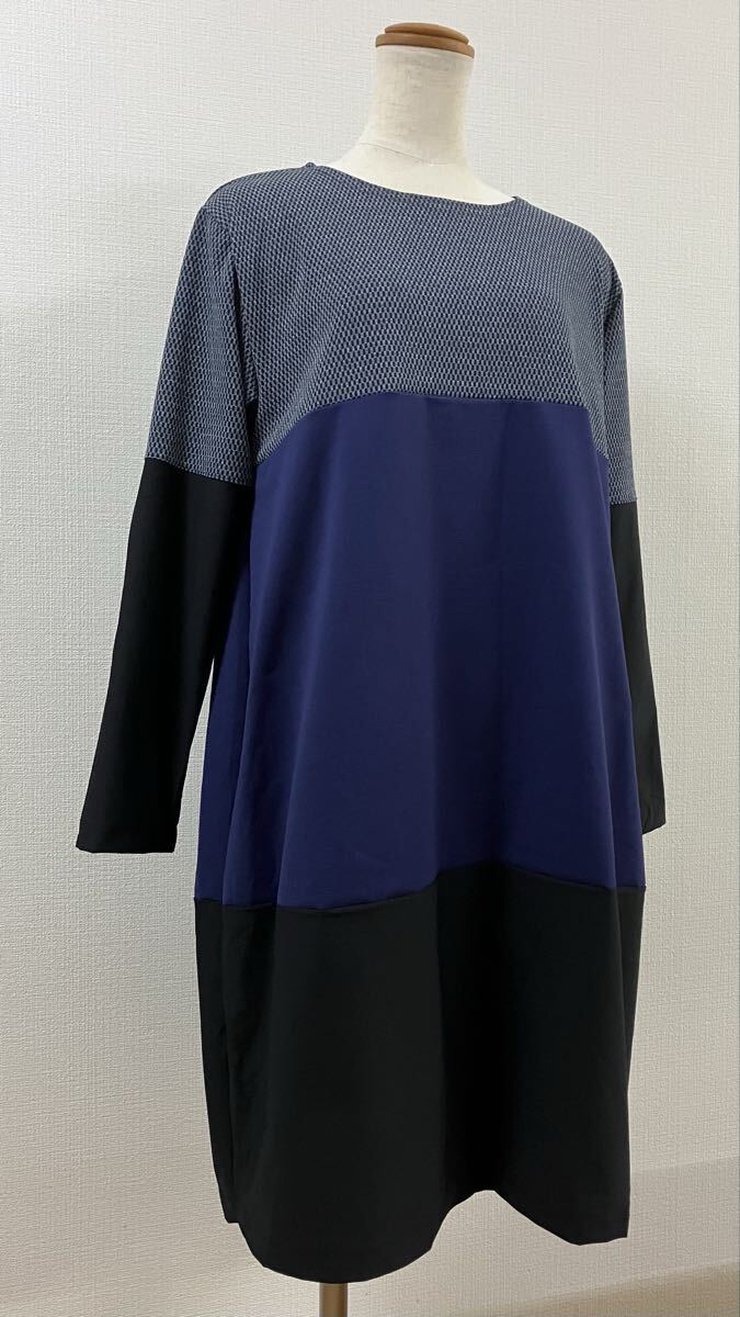 お色は紺×グレー系の柄と、紫系のポリエステル素材、黒系のポリエステルポリウレタン素材の3種類の異素材切替です。たたんでもシワになりづらい素材で着やすいサイズ感もおすすめ!ふんわりデザインのコクーンが可愛いワンピースは1枚で着てもスパッツ等と合わせてもOK!透け感なし伸縮性あり