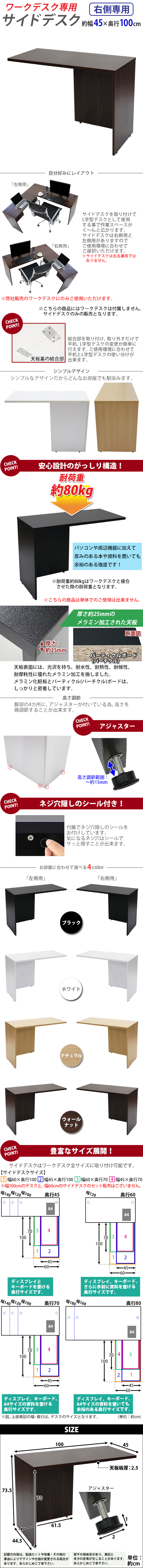 | 商品紹介 | ■弊社販売のワークデスクにのみご使用いただけます。 (こちらの商品は、弊社販売のワークデスクworkdesk,desk07,desk11にのみ使用可能です。) ■作業スペースを広く確保出来る、ワークデスク専用のサイドデスクです。 ■幅が約45cmのタイプです。 ■付属のプレートでワークデスクとサイドデスクを固定するだけの簡単接合。 ■会議室や事務所等、オフィス家具として様々なシーンでお使いいただけます。 ■天板には、メラミン加工を施しています。 ■天板裏の結合金具、ネジ穴隠しのシール付き。 ■アジャスターで高さの調節が可能です。(高さ調節範囲〜約15mm) ※こちらの商品は、組立て式です。組立てにはプラスドライバーが必要です。お客様でご用意ください。 ※組立図が付属します。 ※サイドデスクの取り付けはデスクの右側専用となります。 ■材質:パーティクル(パーチクル)ボード(メラミン加工)(本体)、プラスチック(アジャスター) ■重量:約16kg ■耐荷重:約80kg(ワークデスク接合時) ●新品商品ではありますが、輸入商品の為、多少の擦り傷などがある場合がございますので、ご納得の上ご購入下さいませ。 ●ご購入後、お客様ご都合によるご返品、ご返金等は一切お受け致しておりません。 ●本商品を使用した際に発生したトラブル、事故につきまして、当社は一切の責任を負いません。ご使用に関しましては、全て自己責任にてお願い致します。 ※カラーはウォールナットとなります。 |