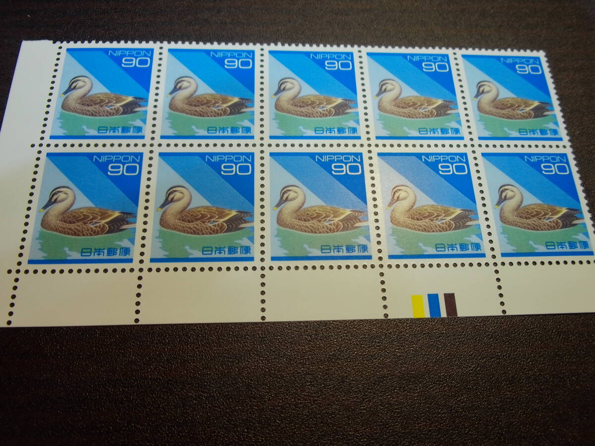 普通切手  90円  カルガモ  カラーマーク付き10枚ブロック  極美品