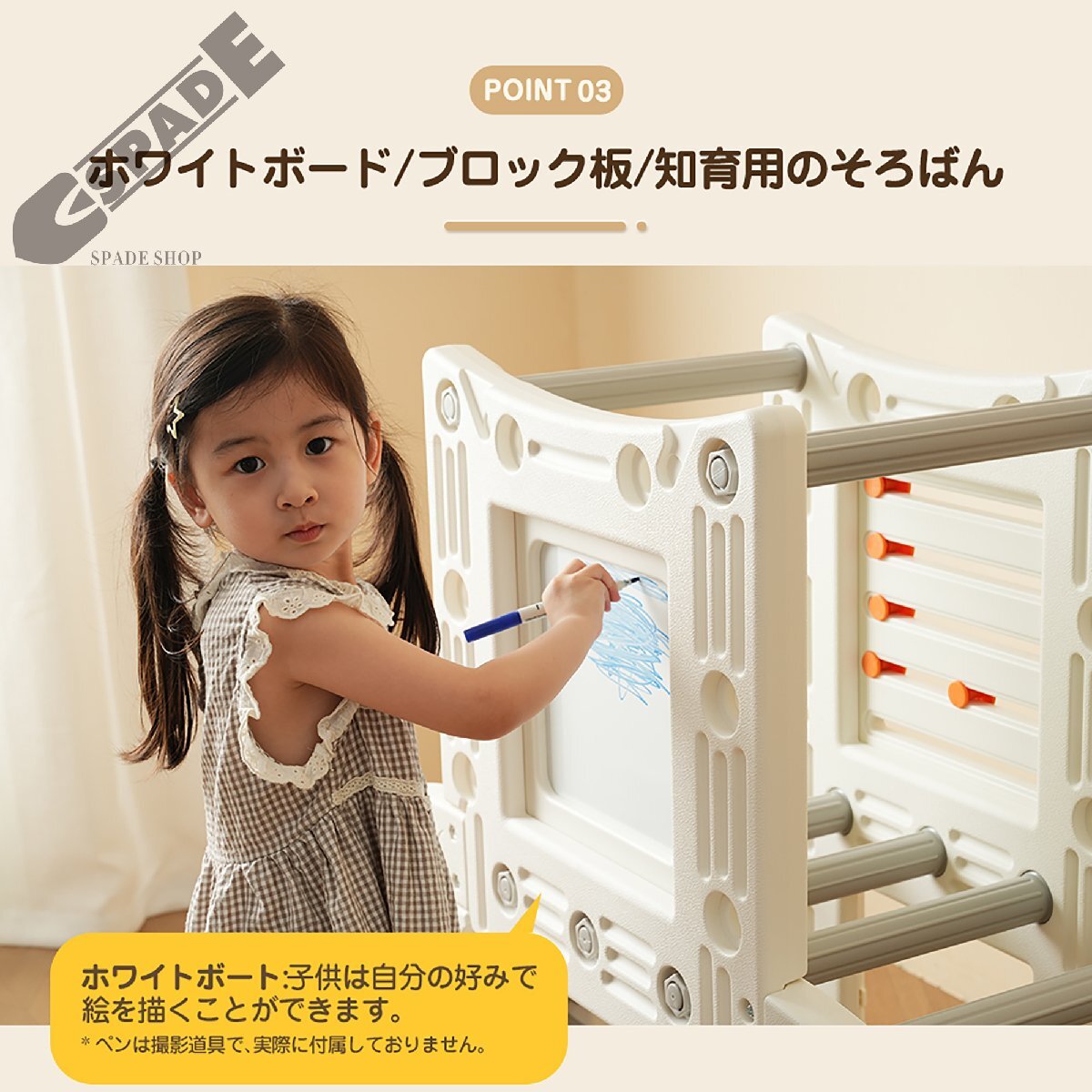 • 【ホワイトボード/ブロック板/知育用のそろばん】ホワイトボート:子供は自分の好みで絵を描くことができます。*ペンは撮影道具で、実際に付属しておりません。ブロック板:ホワイトボードの裏側はブロック板になっており、直径は 1cmのレゴブロックが適用可能です。知育用のそろばん:子供たちの知育にも役立ちます。二つボードは取り外し可能ですので、お子さまはくぐって遊ぶことができますよ。