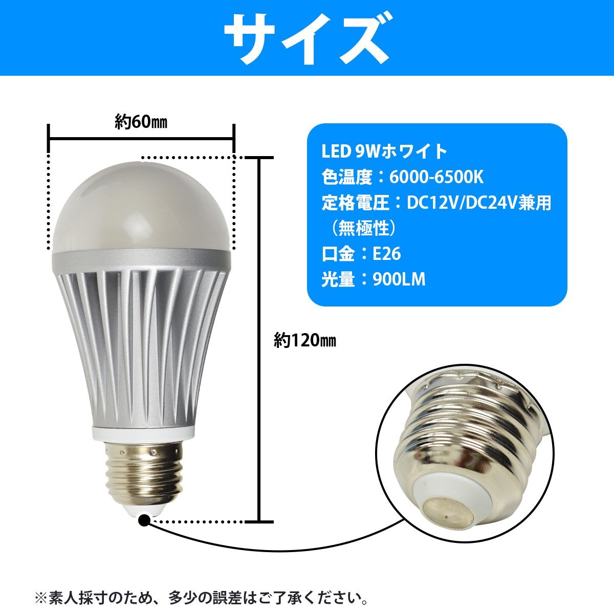 12v 24V 兼用 ノイズレス LED 電球 9W 無極性 900LM 900ルーメン 口金 E26 ホワイト 発光 船舶 キャンピングカー 室内灯 6000k