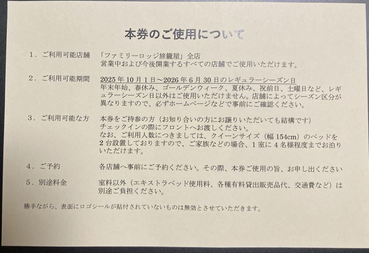 ファミリーロッジ旅籠屋を全国73店舗で展開する旅籠屋の株主優待券1枚です。