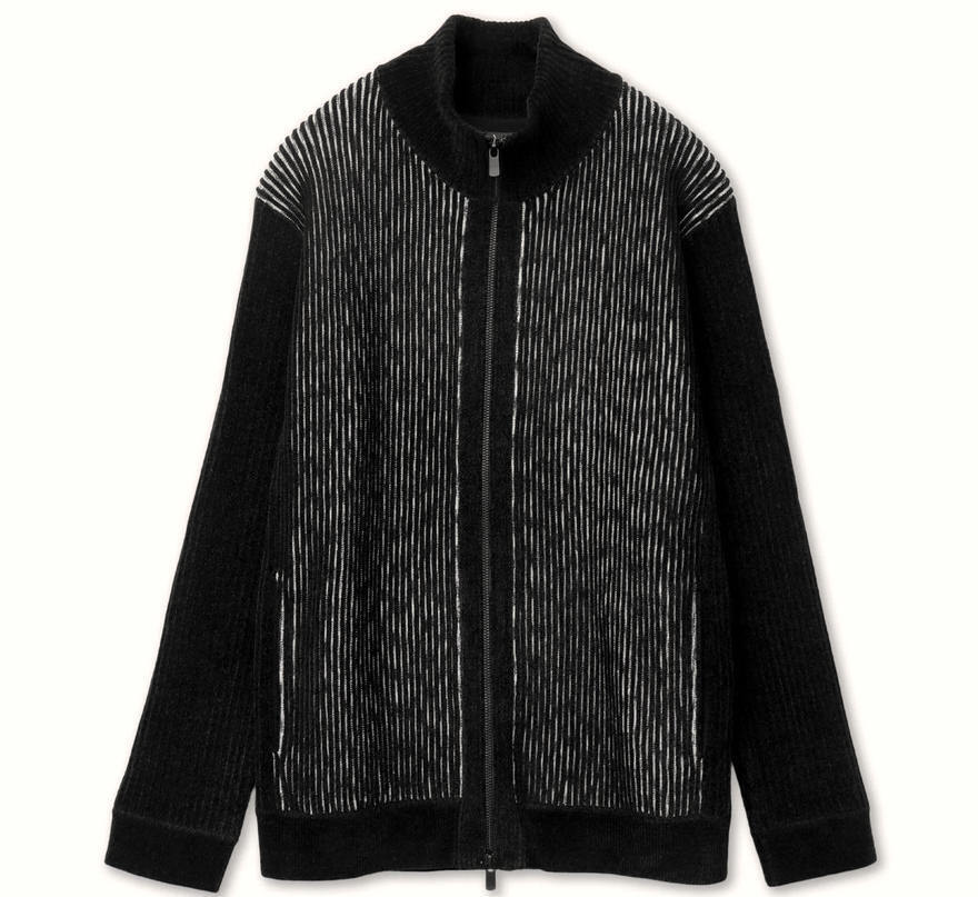 ■袖、脇、衿をソリッドカラーのリブ編みのコンビネーションにすることで、ブルゾンライクに仕上げています