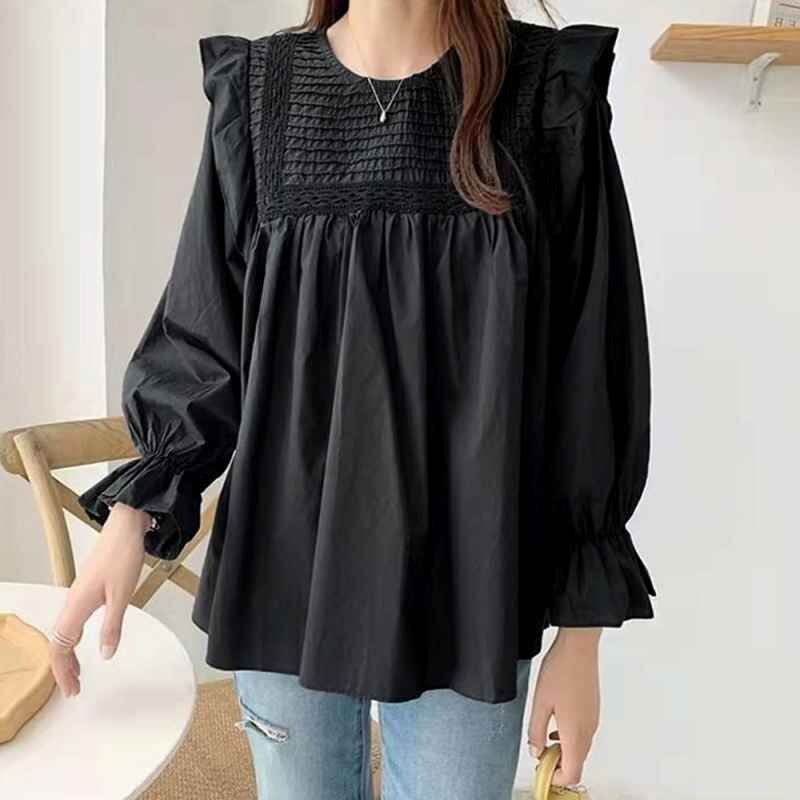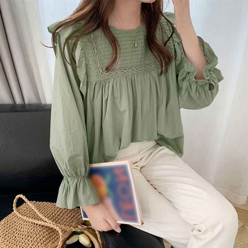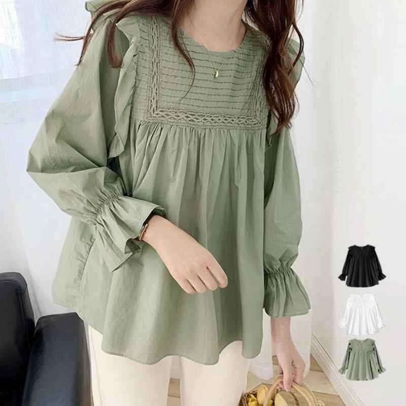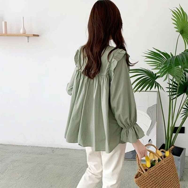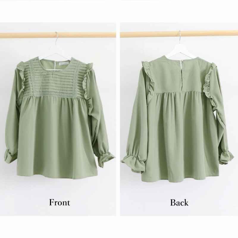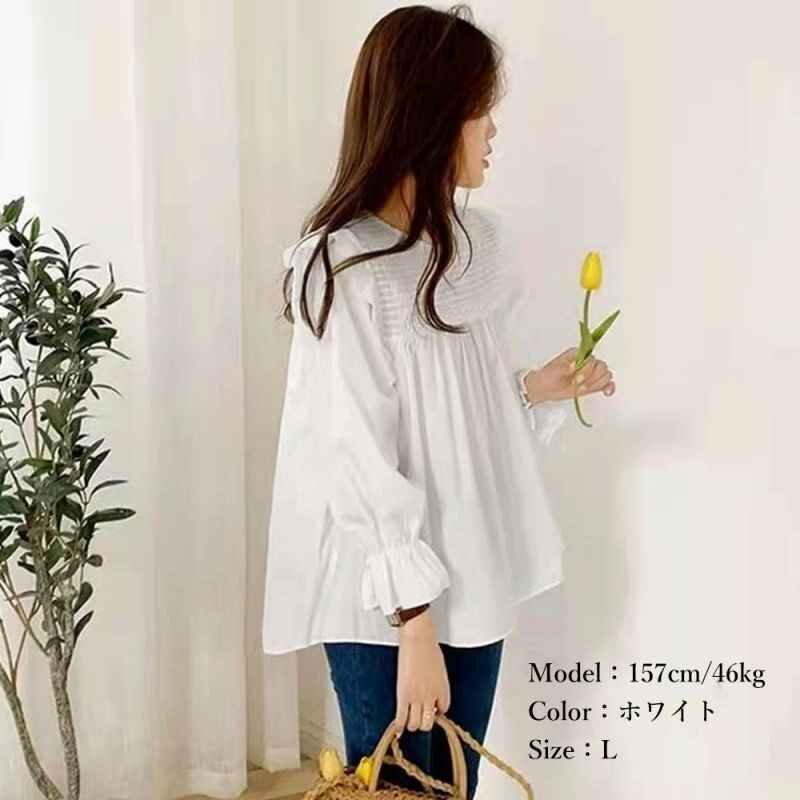 ボリューミーなキャンディスリーブにラッフルショルダー、気になる二の腕を隠して可愛いさ満点のブラウスです。