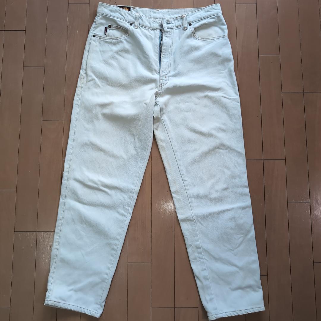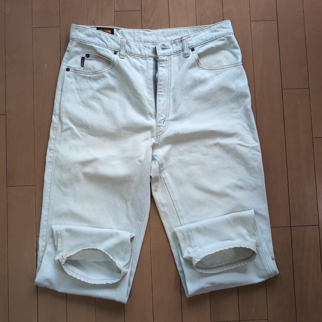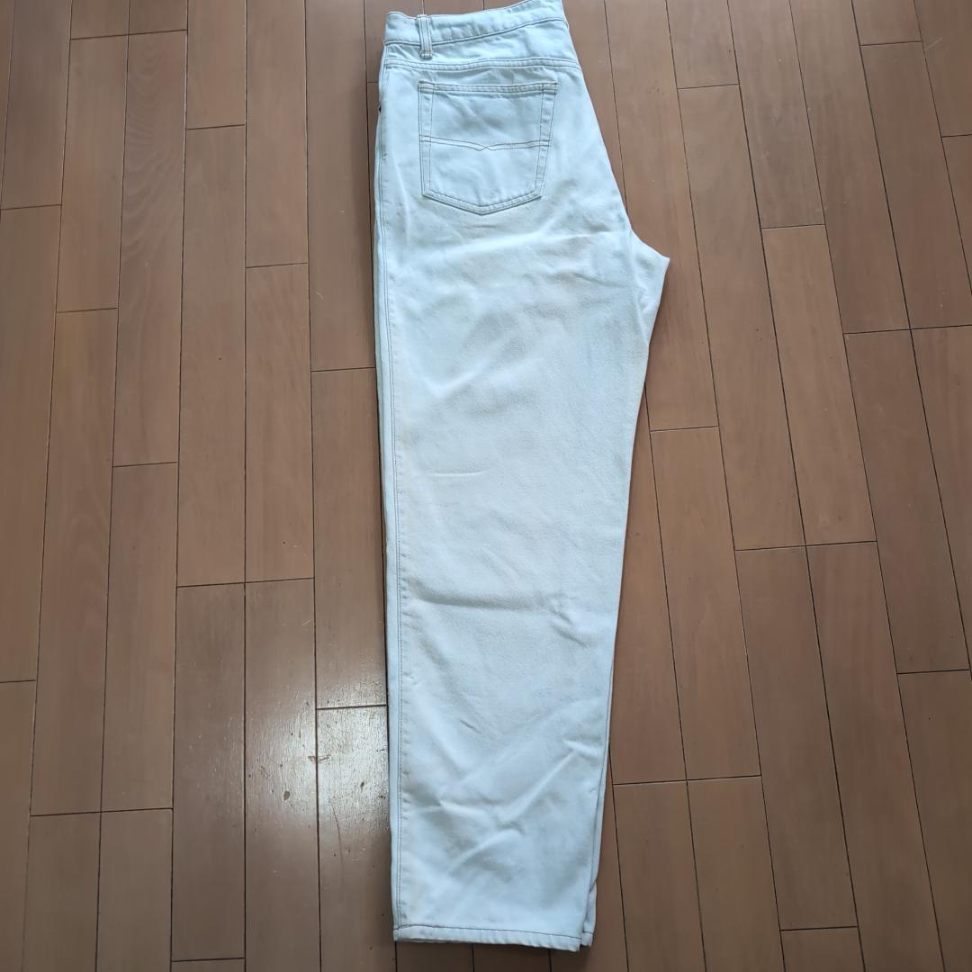 色はクリーミーなホワイトで、白デニム特有の爽やかさを楽しめる一本。ストレートに近いゆとりのあるシルエットで、体型を選ばず自然に穿きこなせます。大人のカジュアルコーデに取り入れやすく、季節を問わず使えるのも魅力です。使用感はあるものの、大きなダメージはなく、まだまだ長くご着用いただける状態です。