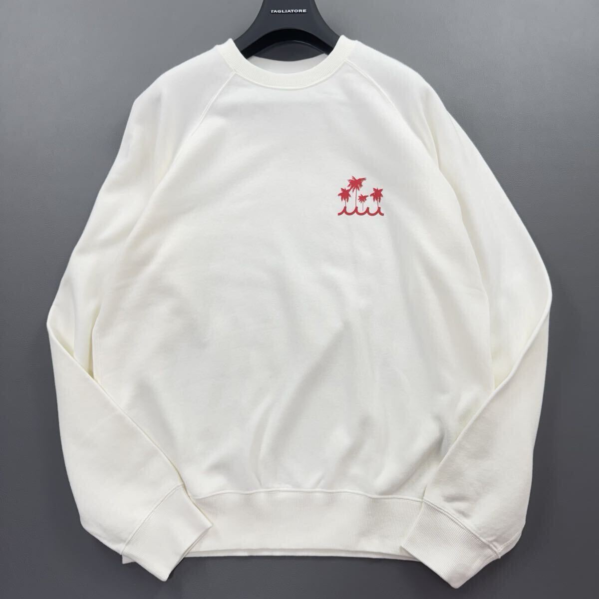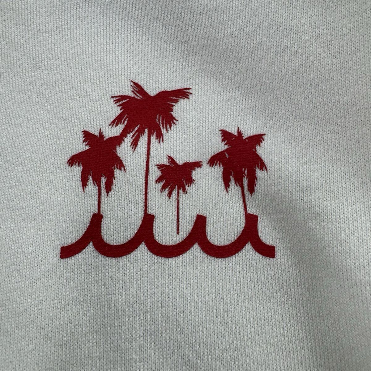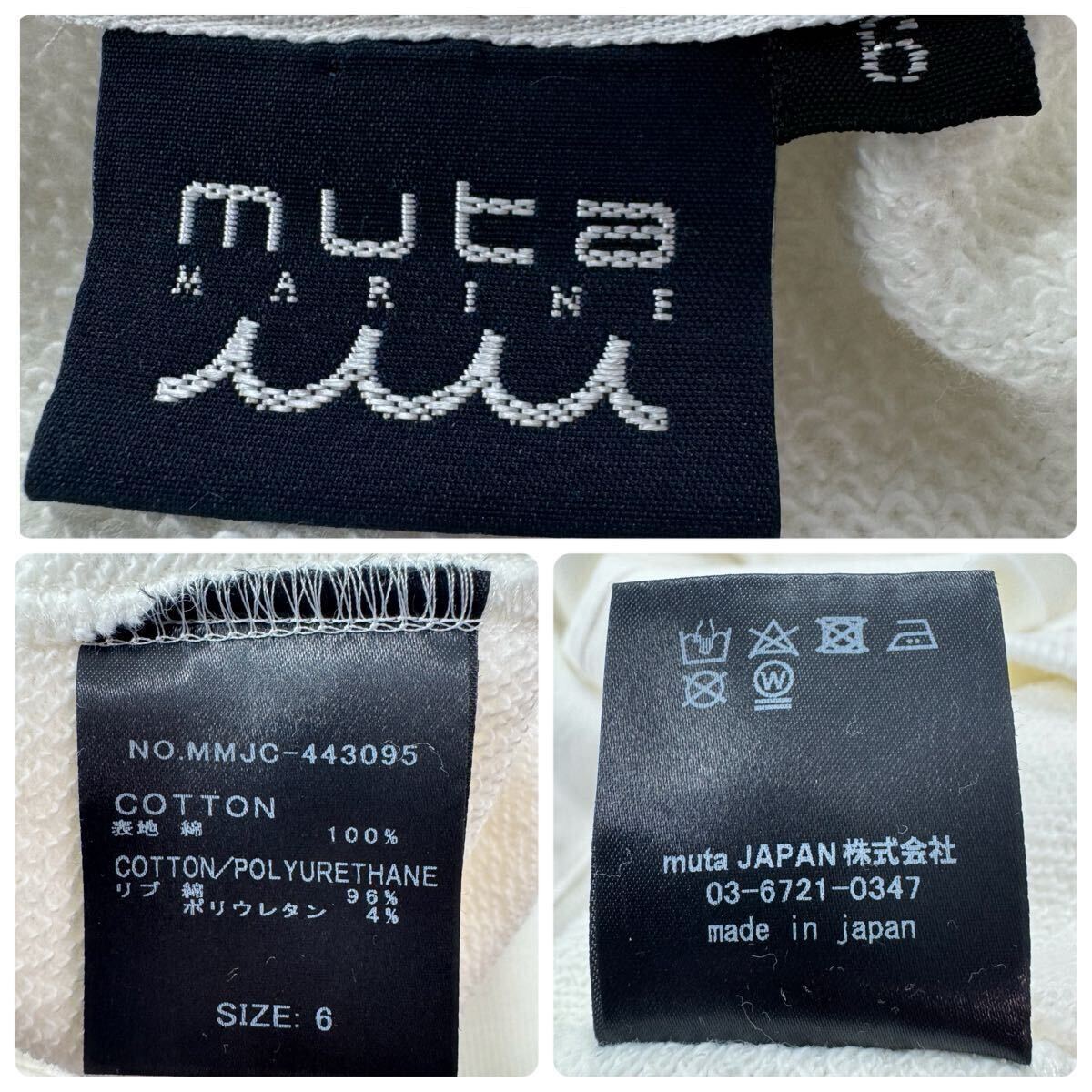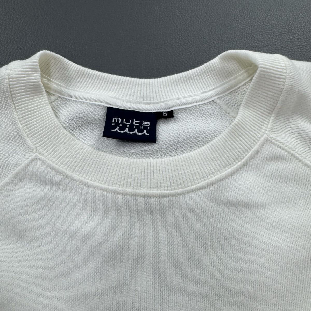 muta MARINEの近年モデルスウェットです。胸元のヤシ柄プリントと、背面ロゴが映える人気デザイン。柔らかな裏パイルのコットン100%で着心地も快適。ラグラン仕様で動きやすく、デイリーに使いやすい一枚です。全体的に良好な状態で長くご愛用いただけます。日本製・サイズ6。
