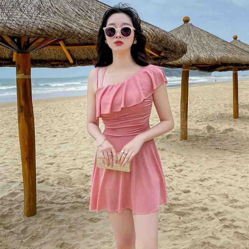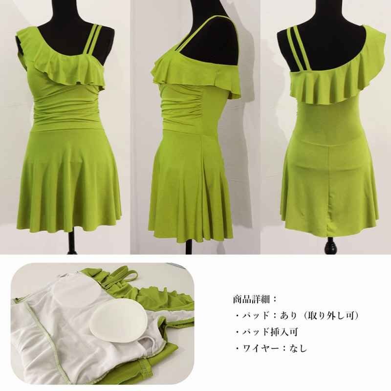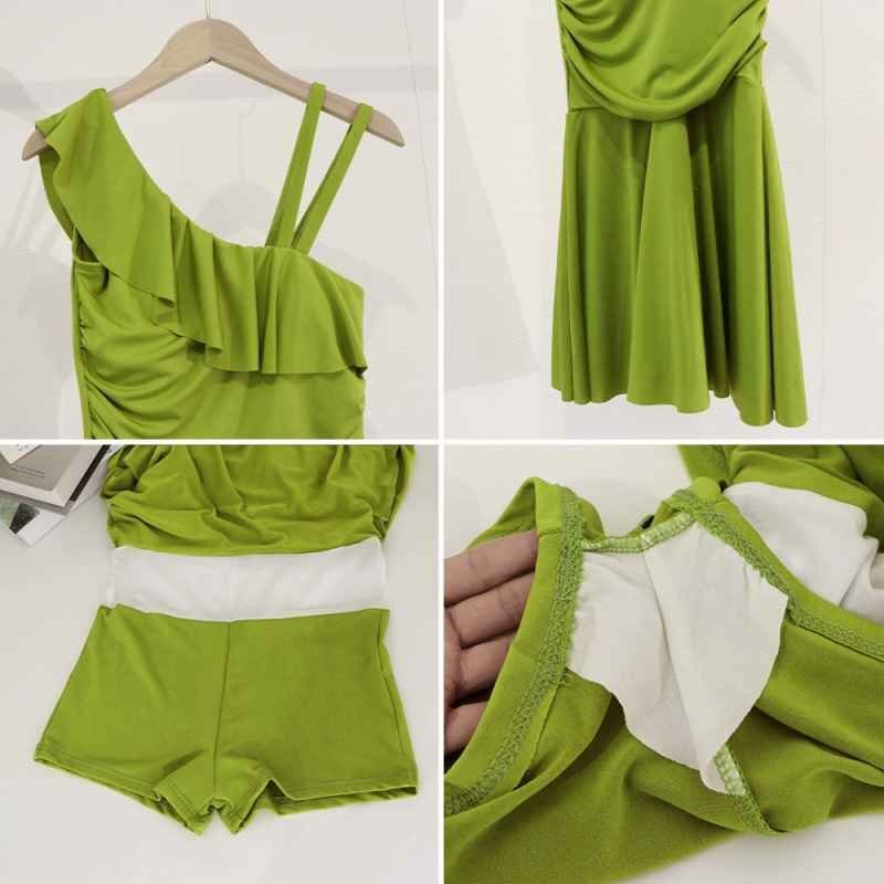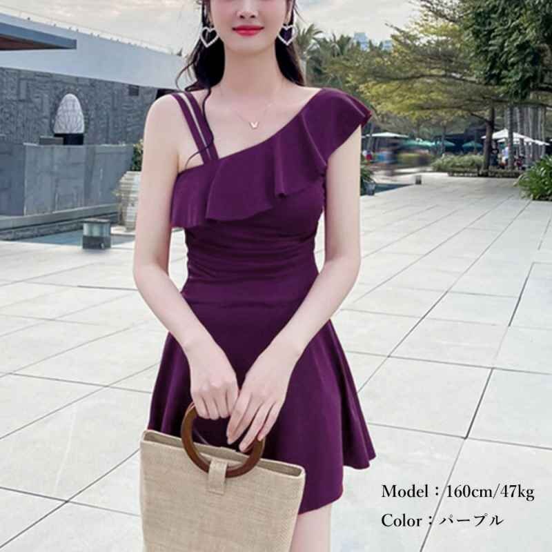 肩まわりのフリルとスカート部分のフレアシルエットがかわいいワンショルダーワンピース水着です。