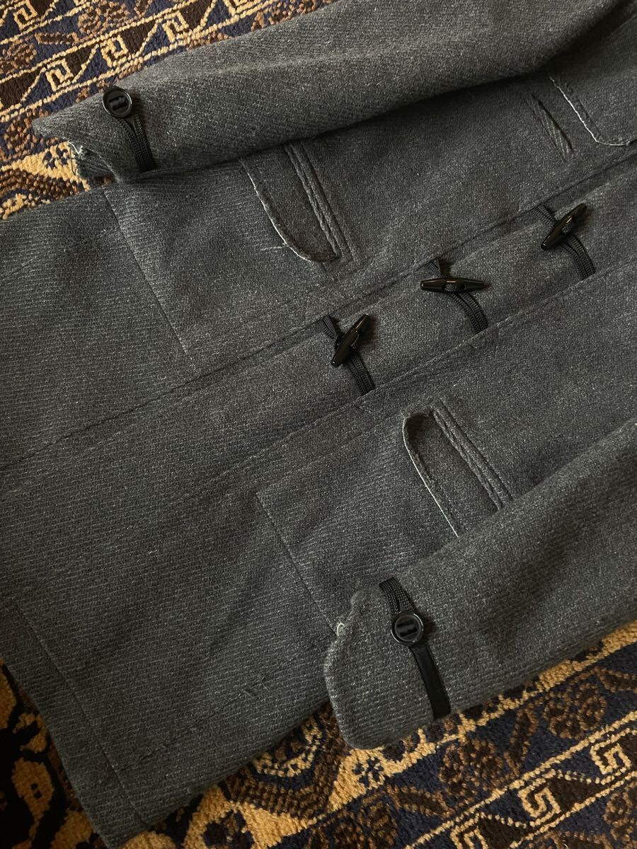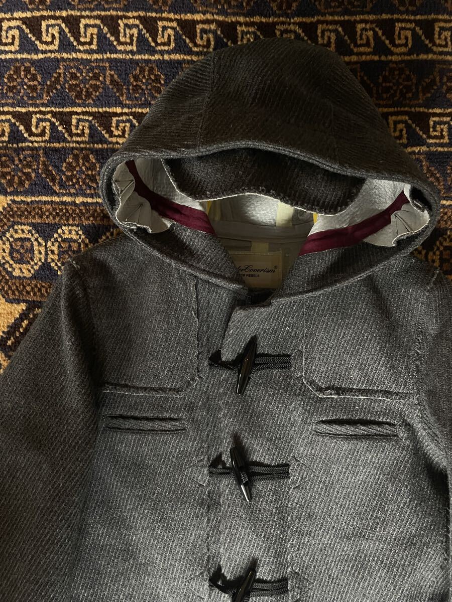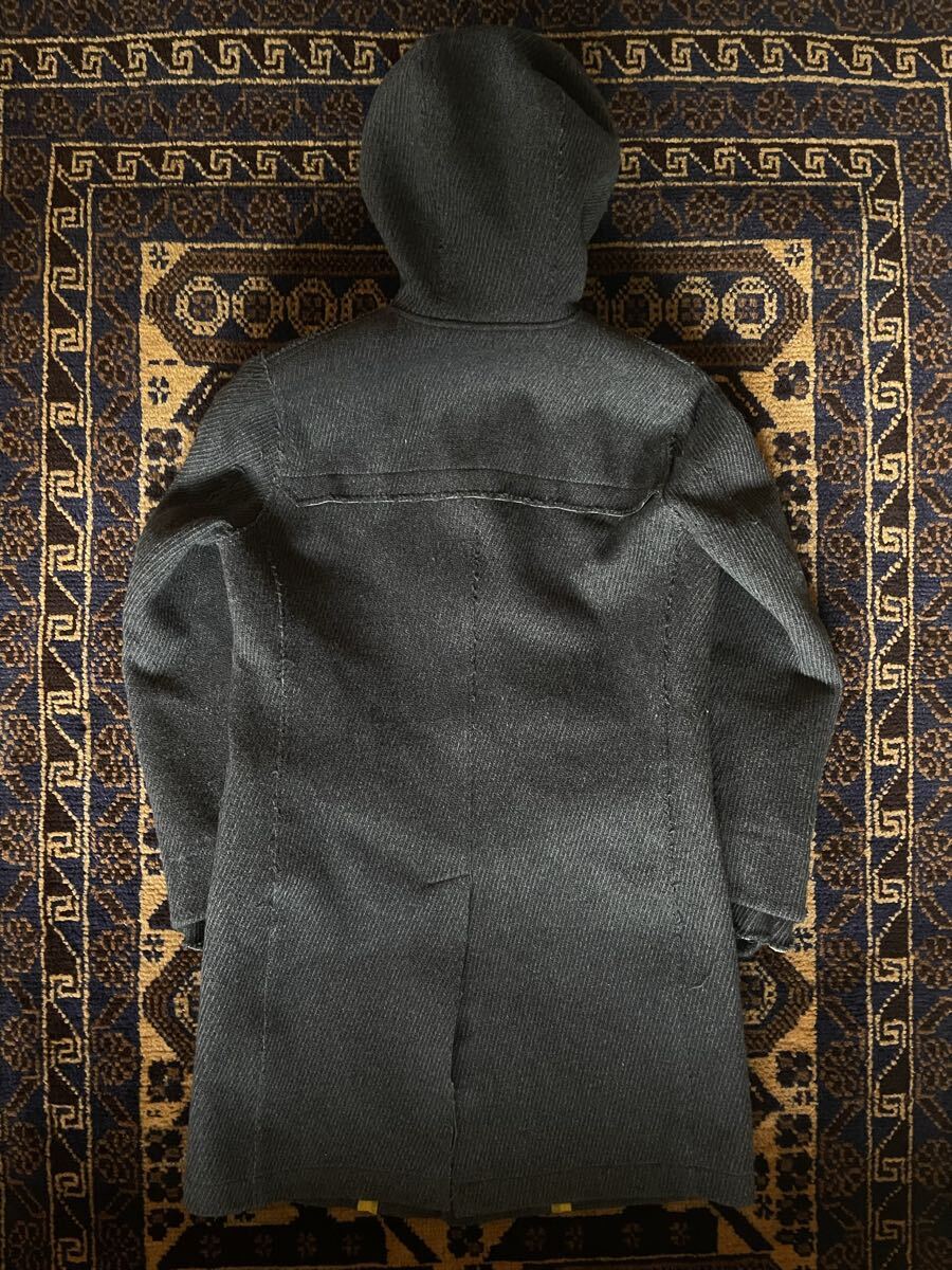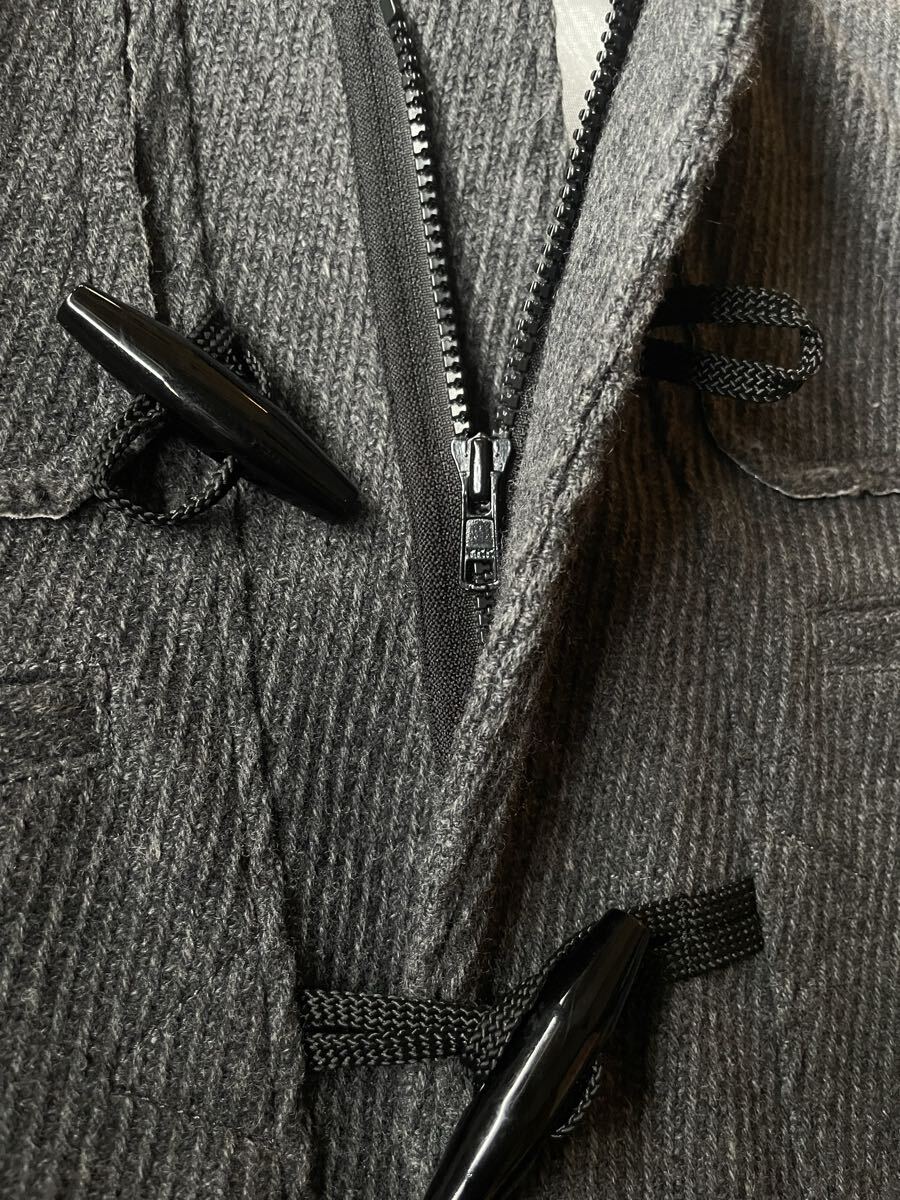 大きいフードにシンプルなトグルボタン、共布による肩の補強と大きめのハンドウォーマーポケットと、クラシックなダッフルコートの作りですが、最近復刻された初期のone and onlyのダッフルコートから続くほつれ加工、バイザーとイヤーマフ付きのフード、フロントダブルジップに二つの胸ポケット、袖口のバルタン星人のようなデザイン構造、カシミヤ混の上質で高密度なウール生地にハイテクな開発素材を裏地に張り合わせ、シームテープによる防水加工等、保温性、防水・防風性にも優れたハイスペックでデザイン的にも凝りまくってる一着になっています。